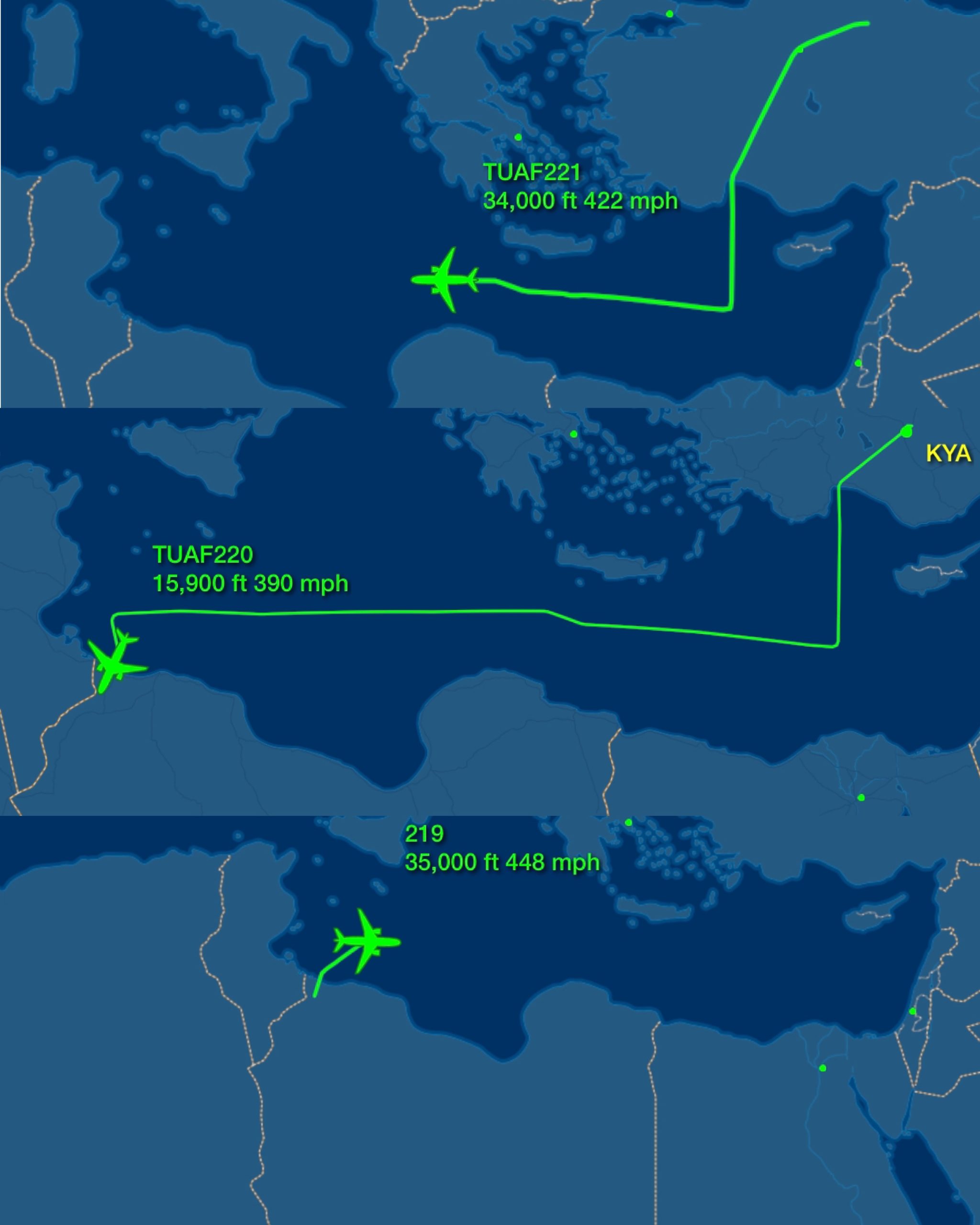 ورُصدت هذه الطائرات في رحلات مابين قواعد “كونيا ، قيصري ، ميرزفون ، أتاتورك في أزمير” نحو قاعدة الوطية غربي ليبيا، وبدرجة أقل نحو الكلية الجوية مصراتة حيث تتمركز قوة تركية وإيطالية بالقاعدة.