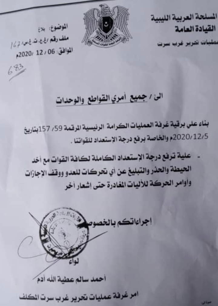 وبالتزامن مع هذه التطورات ، وجّه اللواء أحمد سالم آمر غرفة غرب سرت في القيادة العامة برفع الاستعداد وقطع الإجازات ومنع مغادرة السيارات العسكرية وتكثيف الرصد؛ تأهبًا لأي “عدوان تركي”.