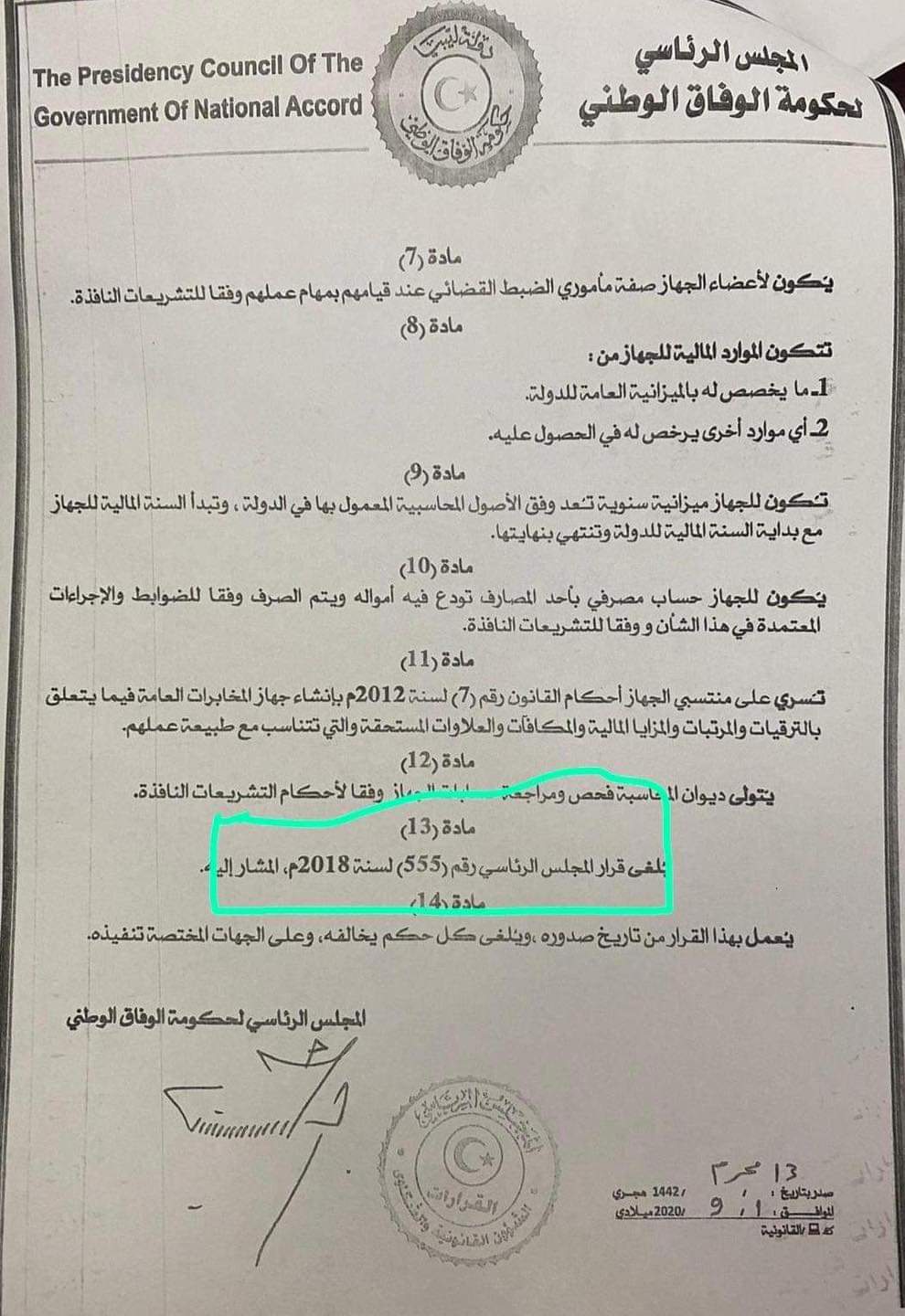 ويتولى ديوان المحاسبة فحص ومراجعة الجهاز وفقا لأحكام التشريعات النافذة، ويلغى قرار المجلس الرئاسي رقم (555) لسنة 2018م , المشار إليه.