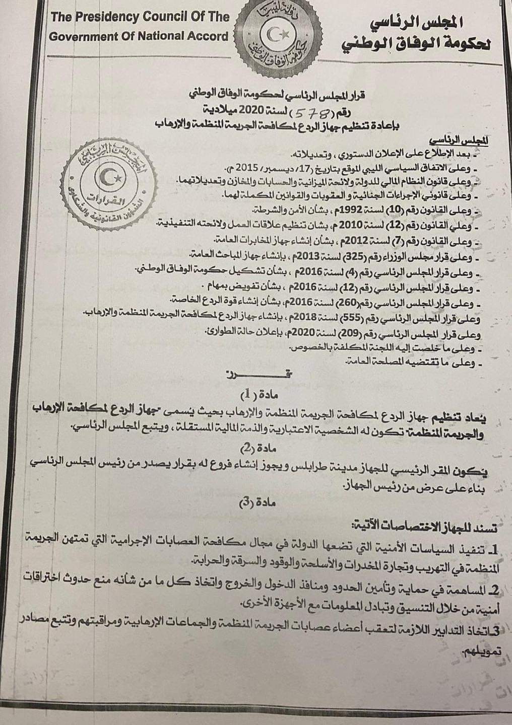 ليبيا – رئيس أصدر المجلس الرئاسي فايز السراج ، قرارا بإعادة تنظيم جهاز قوة الردع الخاصة بقيادة عبدالرؤوف كارة، ليصبح تابعاً له بشكل مباشر بذمة مالية مستقلة، بعيدا عن وزارة الداخلية التي يترأسها فتحي باشاغا.