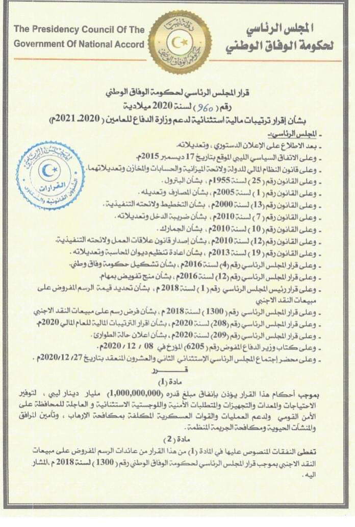 السراج أوضح في قراره رقم “960” والذي أطلعت المرصد على نسخة منه أن المادة الثانية ستغطي النفقات المنصوص عليها في المادة الأولى من عائدات الرسم المفروض على مبيعات النقد الأجنبي بموجب قرار المجلس الرئاسي رقم “1300”لعام 2018.