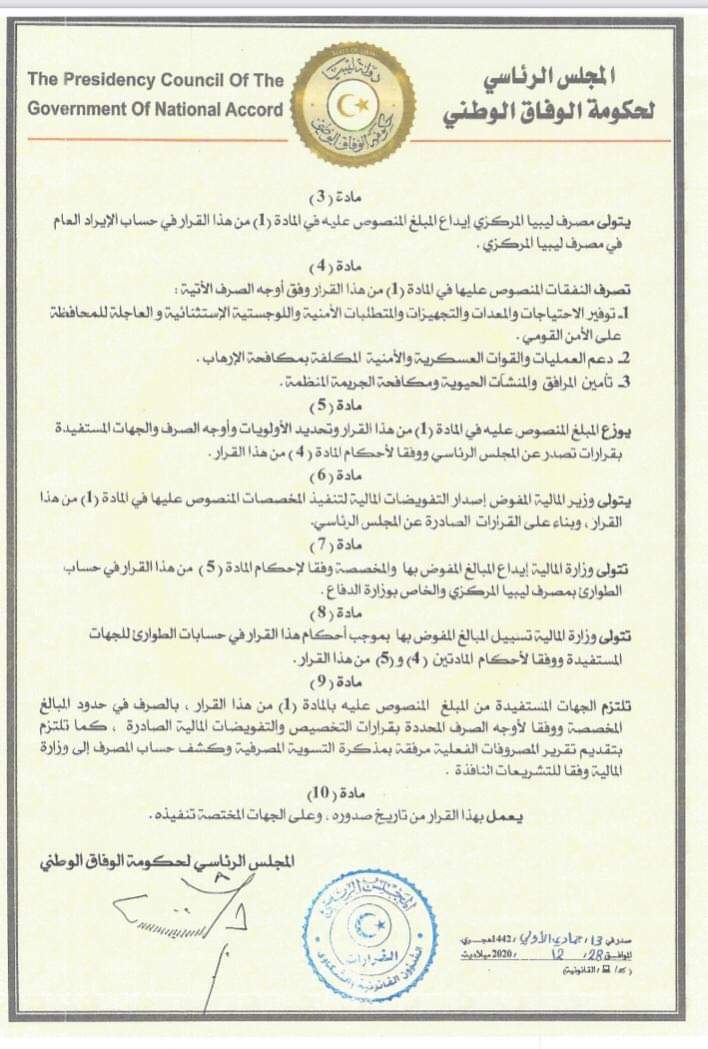 كما لفت قرار رئيس الرئاسي الى أن تتولى وزارة المالية إيداع المبالغ المفوض بها والمخصصة وفقا لإحكام المادة ( 5 ) من هذا القرار في حساب الطوارئ بمصرف ليبيا المركزي والخاص بوزارة الدفاع وأن تتولى وزارة المالية تسبيل المبالغ المفوض بها بموجب أحكام هذا القرار في حسابات الطوارئ للجهات المستفيدة ووفقا لأحكام المادتين ( 4 ) من هذا القرار.