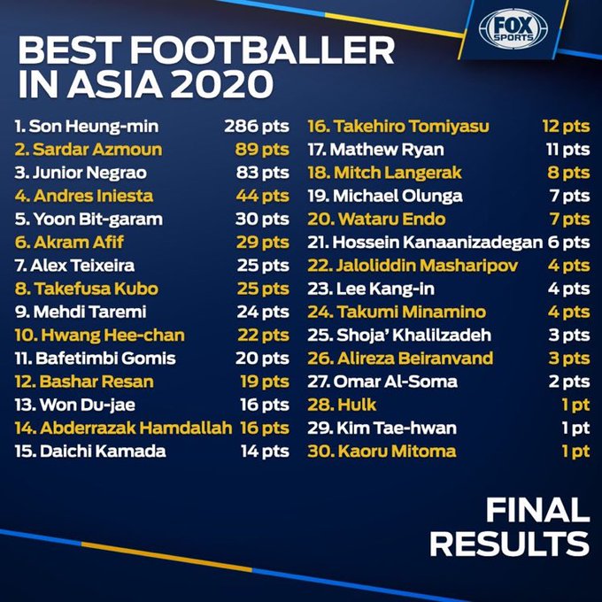 وتصدر الكوري الجنوبي هيونغ مين سون، مهاجم فريق توتنهام هوتسبير الإنجليزي، قائمة أفضل لاعب كرة قدم في آسيا، برصيد 286 نقطة، متقدما بفارق كبير جدا عن وصيفه الإيراني سردار أزمون، مهاجم فريق زينيت بطرسبورغ الروسي، الذي حصل على 89 نقطة.