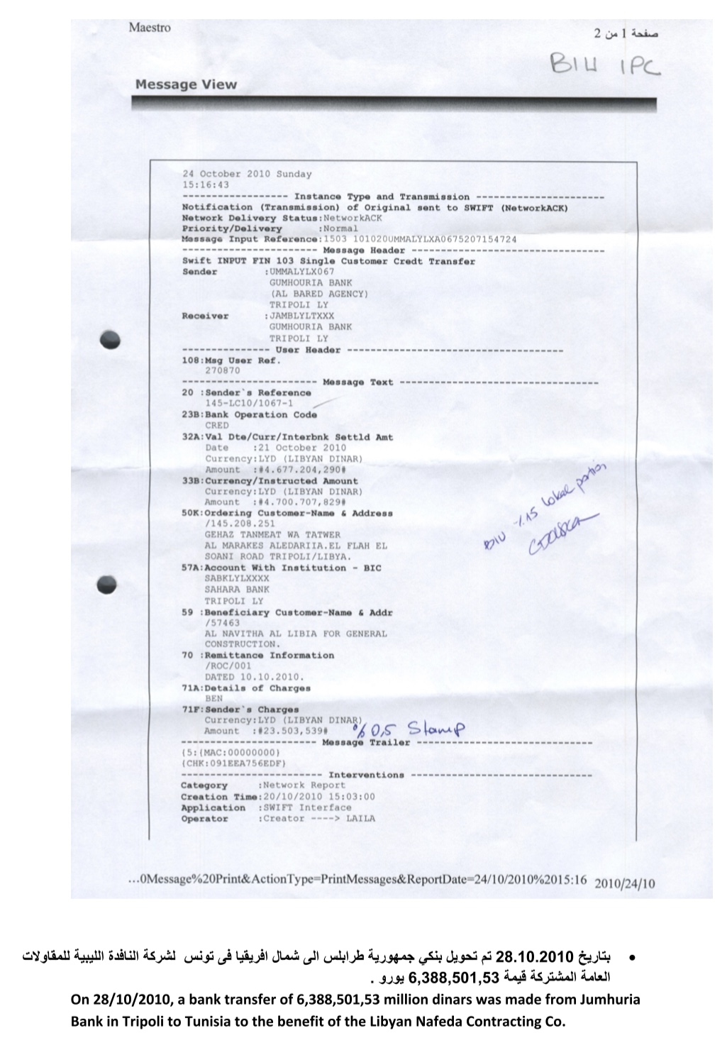 وجاء في الطلب فتح خطاب اعتماد لهذا التجديد، وهذا كله قبل توقيع العقد، ولم يتم إعطاء أي مبلغ، ويتضمن معلومات عن الحساب المصرفي لـ”النافذة” في بنك شمال إفريقيا الدولي في تونس وفي مصرف الصحاري في العاصمة طرابلس، ليصدر في الـ15 من مارس من ذات العام خطاب اعتماد قابل للإلغاء بقيمة 48 مليون دينار.