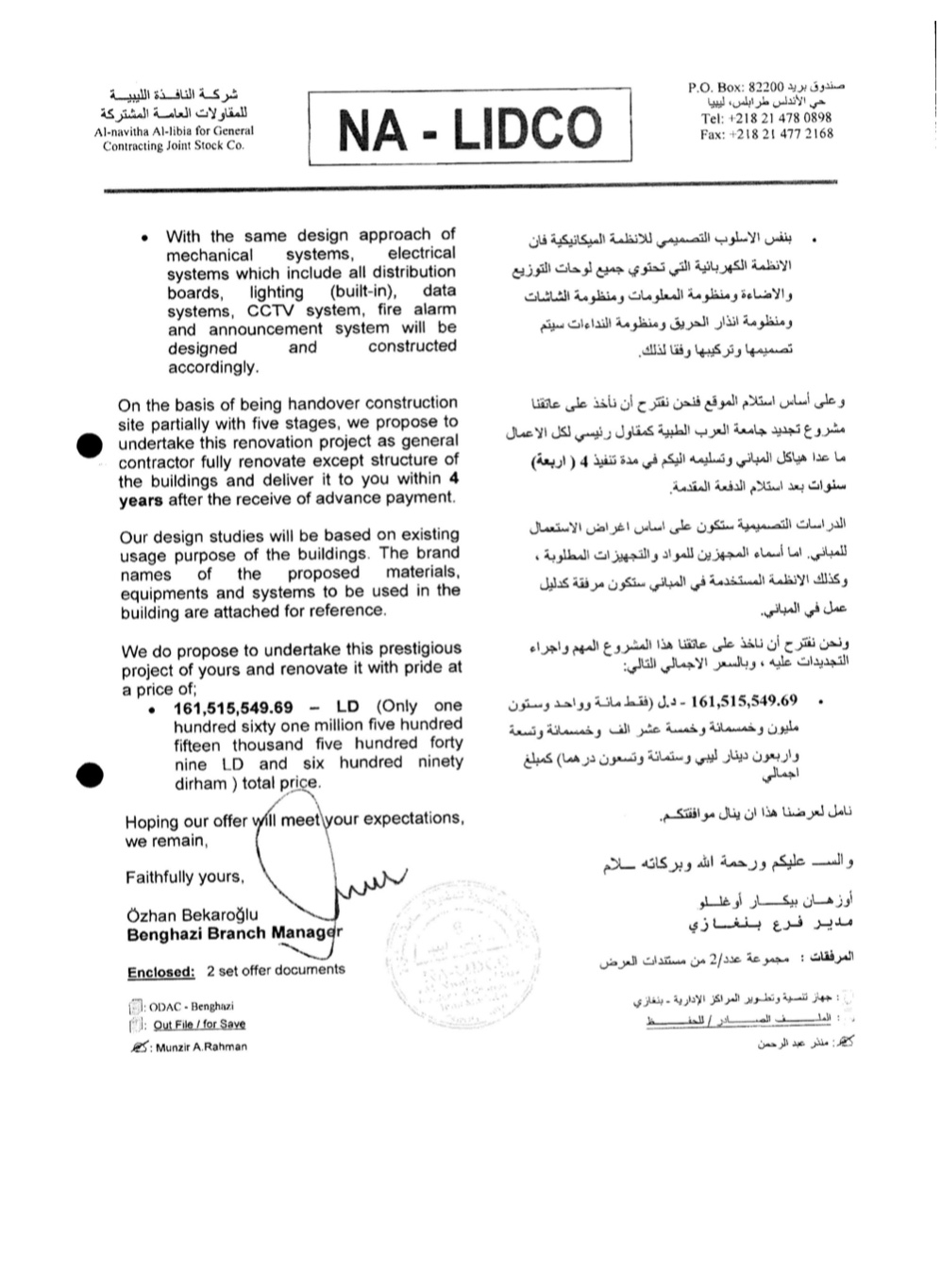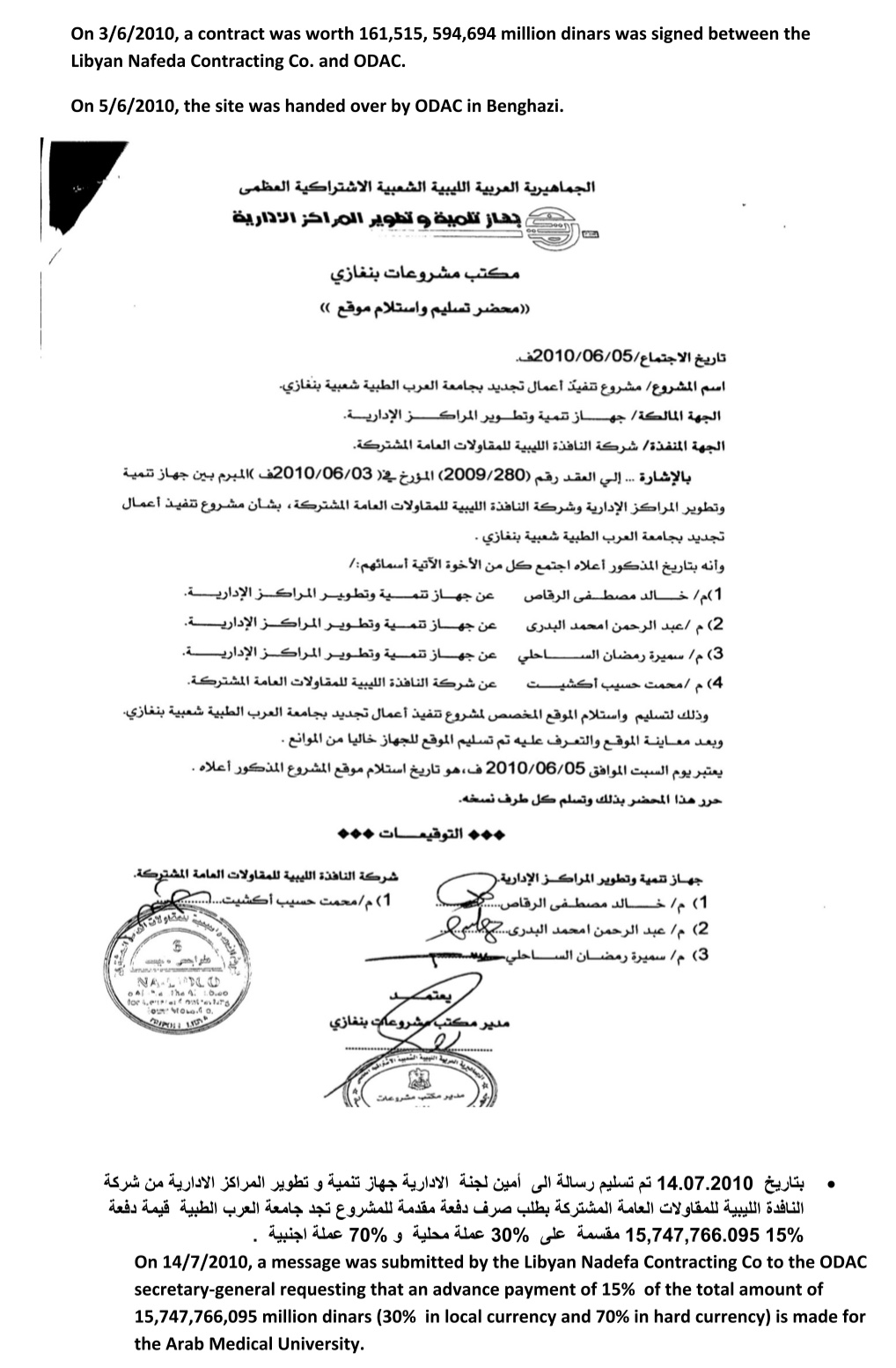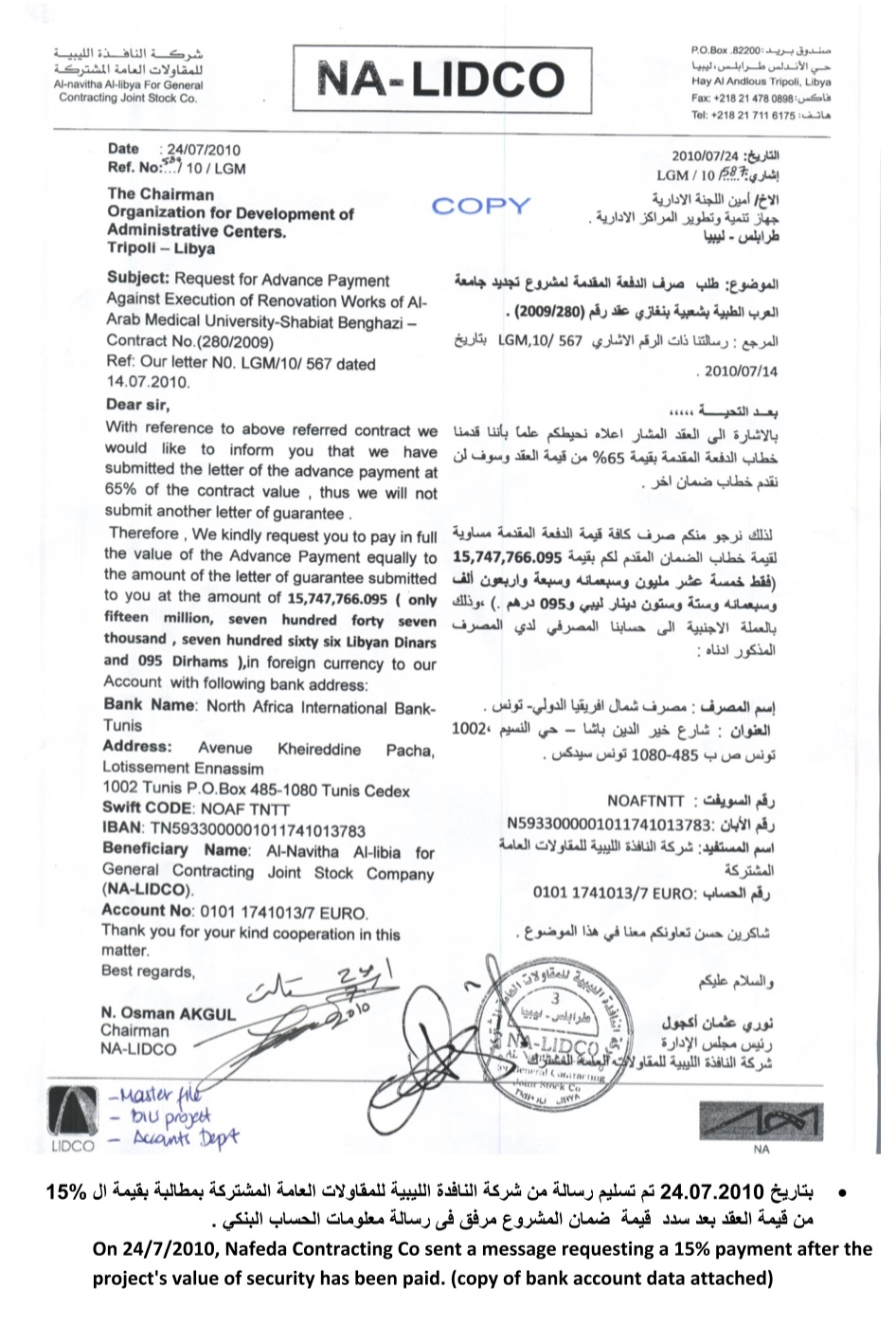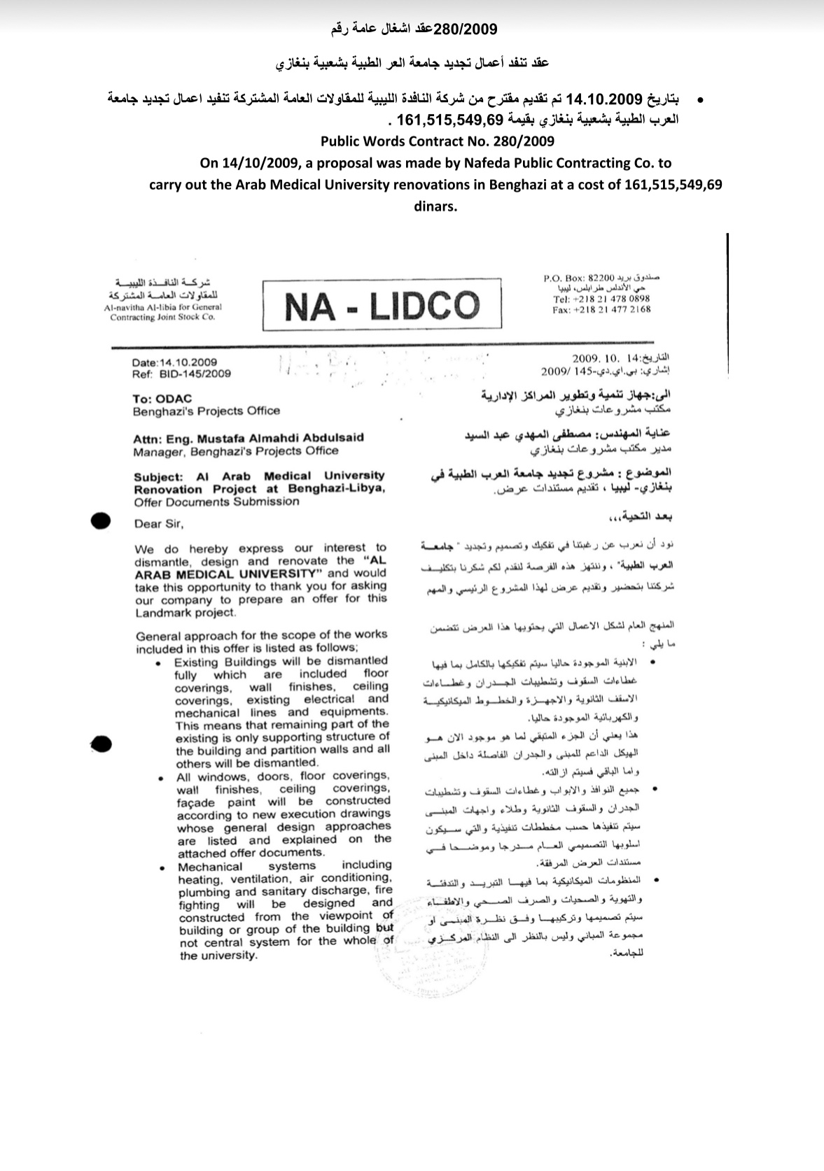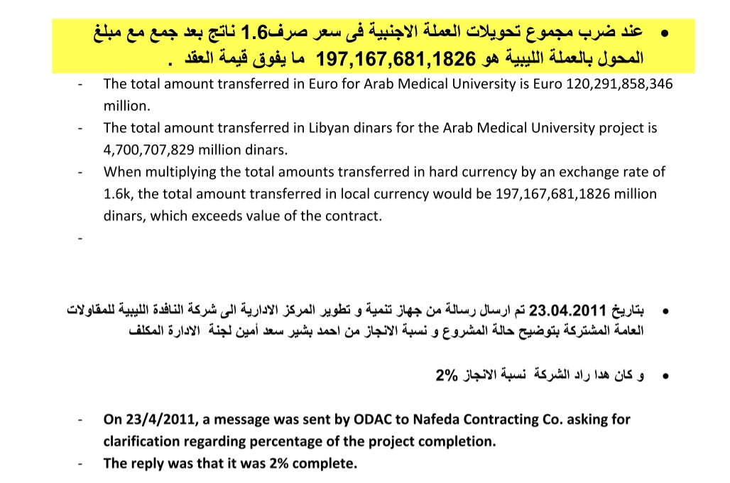 وأضاف التقرير أن هذا الاقتراح مفاده عقد بقيمة 161 مليونًا ونصف المليون دينار لتجديد جامعة العرب الطبية، وصولًا إلى الجدران الهيكلية، وعلى مدار 4 سنوات بسعر صرف رسمي للدينار بلغ آنذاك 1.6 يورو، فيما كتب نوري عثمان أكاجول في الـ10 من فبراير عام 2010 طلبًا إلى رئيس المركز علي الدبيبة.
