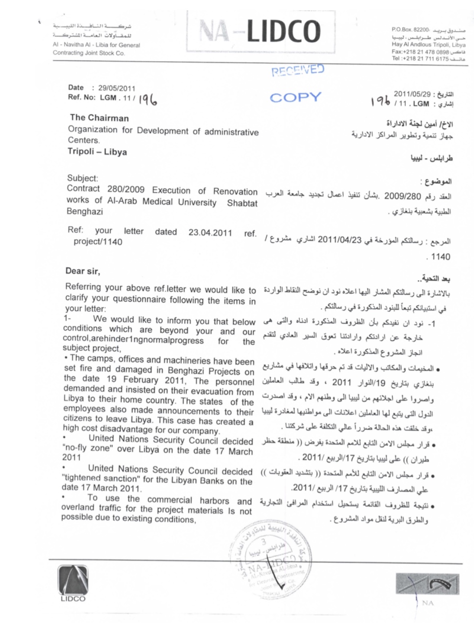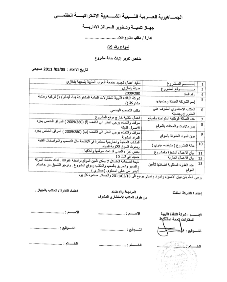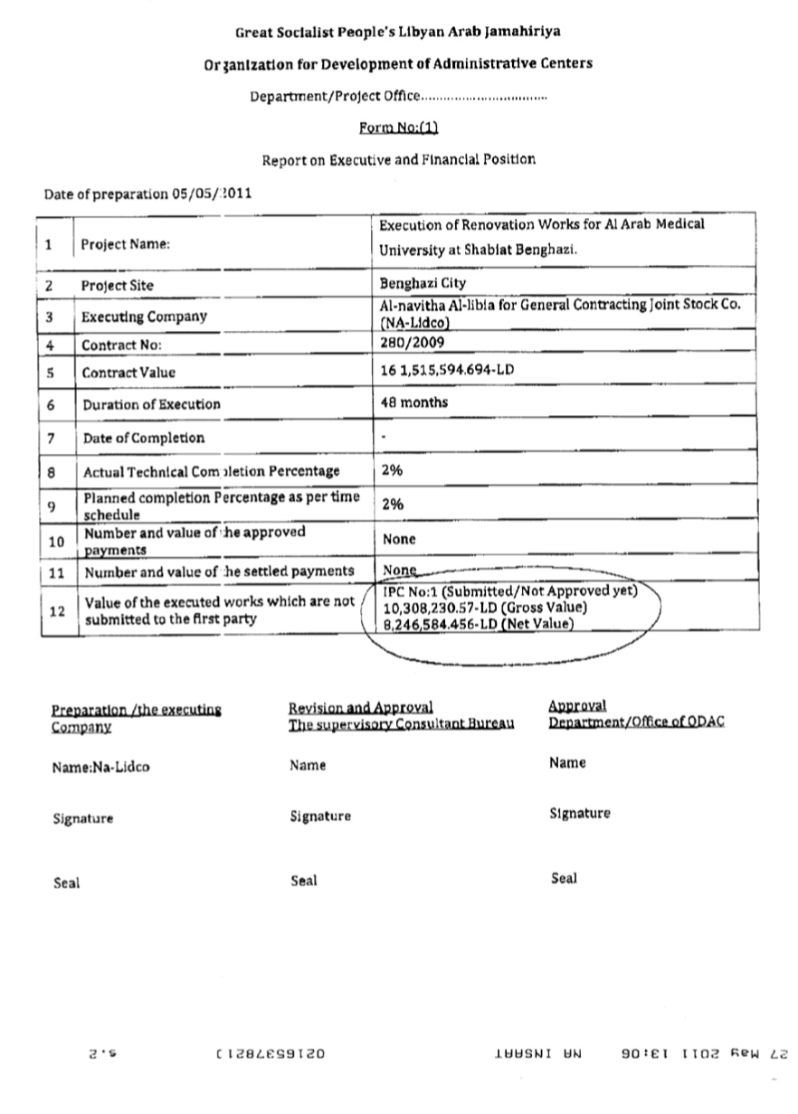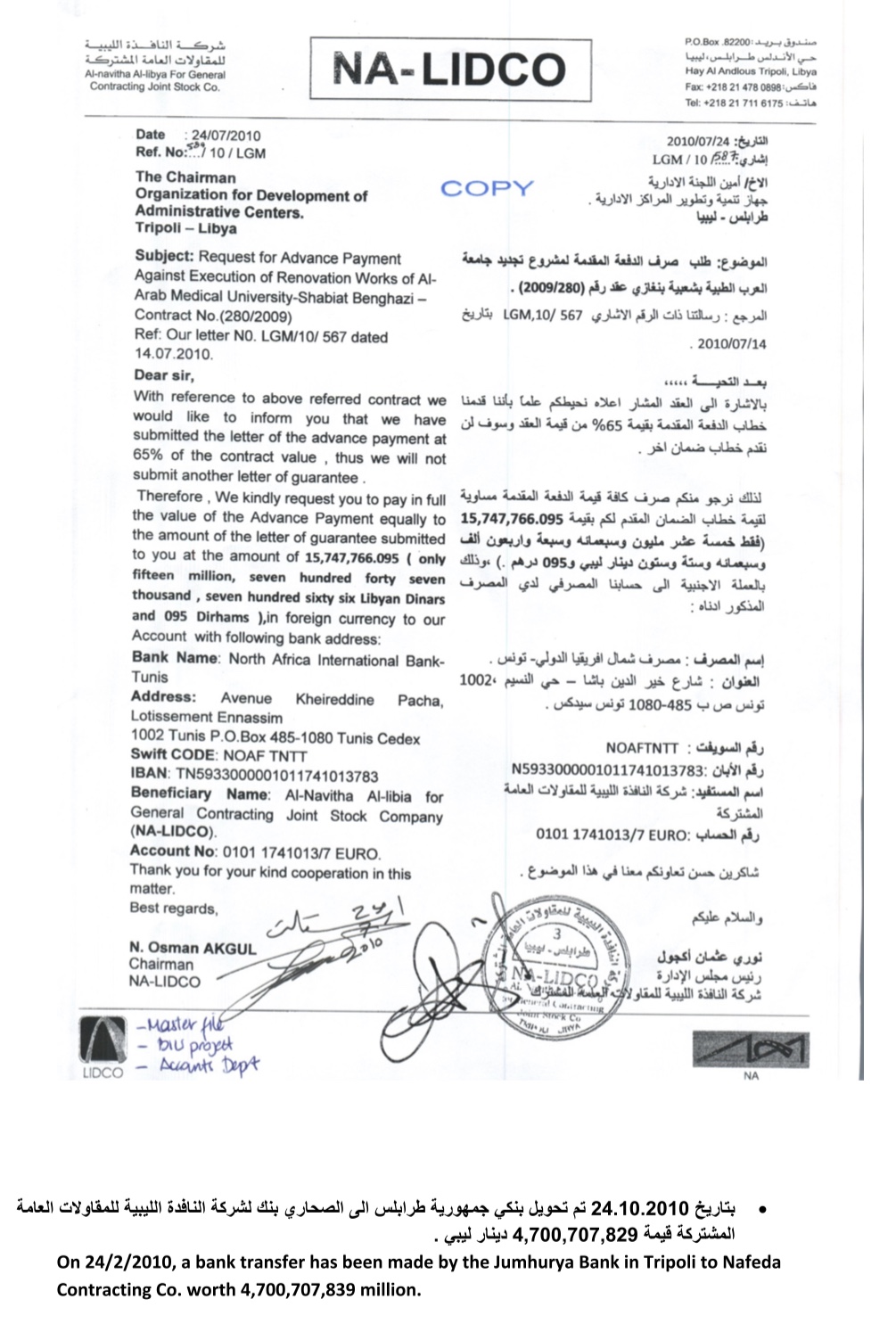 وأضاف التقرير أن هذا الاقتراح مفاده عقد بقيمة 161 مليونًا ونصف المليون دينار لتجديد جامعة العرب الطبية، وصولًا إلى الجدران الهيكلية، وعلى مدار 4 سنوات بسعر صرف رسمي للدينار بلغ آنذاك 1.6 يورو، فيما كتب نوري عثمان أكاجول في الـ10 من فبراير عام 2010 طلبًا إلى رئيس المركز علي الدبيبة.