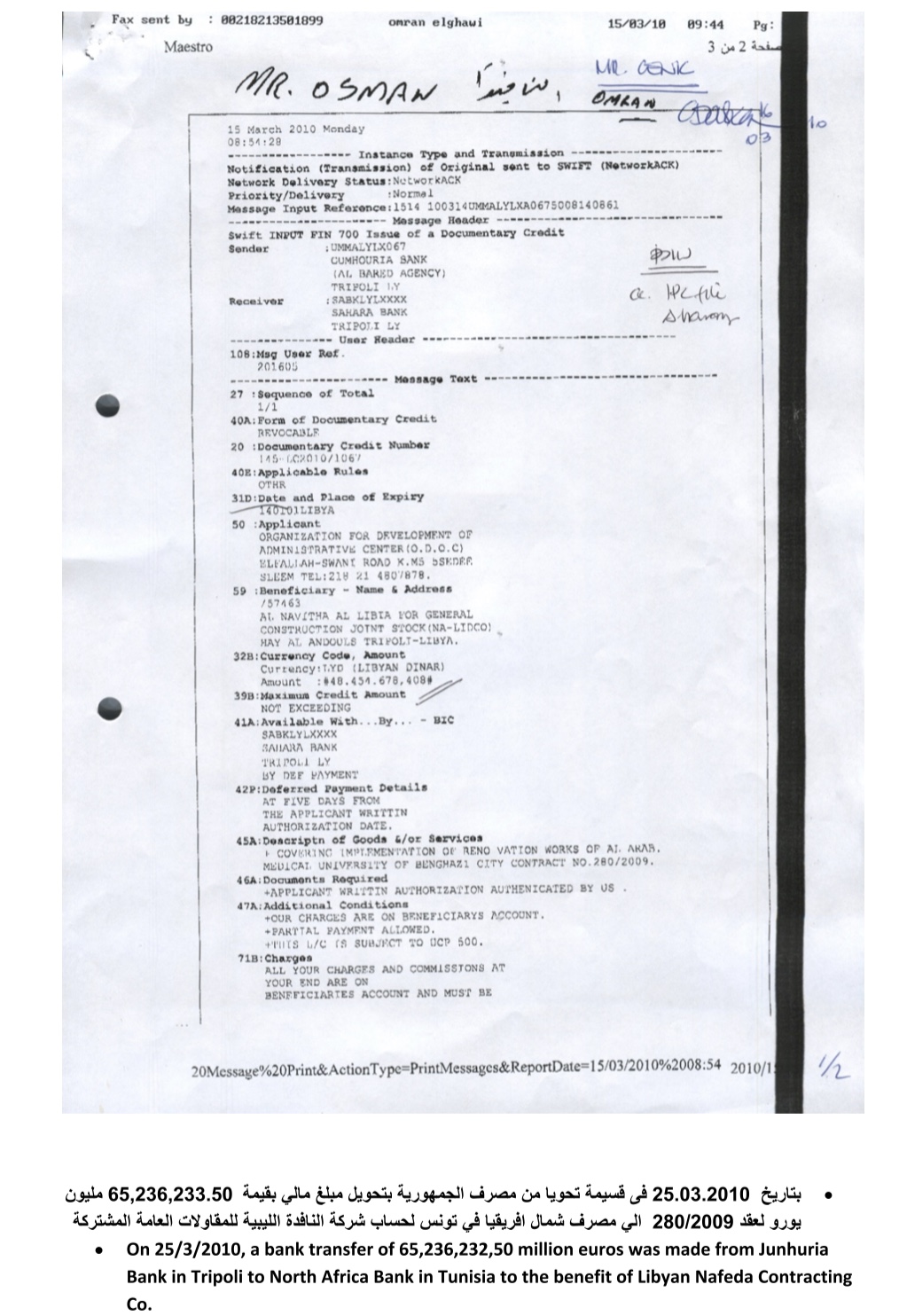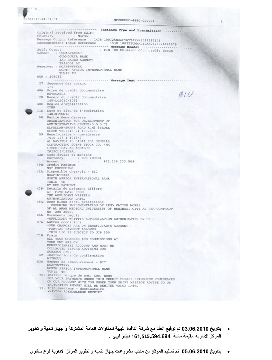 وهذا الاعتماد لحساب “النافذة” في مصرف الصحاري، فيما شهد الـ25 من ذات الشهر والعام إصدار خطاب اعتماد قابل للإلغاء بقيمة 65 مليون دينار لنفس الشركة وفي حسابها في بنك شمال إفريقيا الدولي، ليتم في الـ3 من يونيو عام 2010 توقيع العقد 280 بين شركة “النافذة” و”أوداك”.