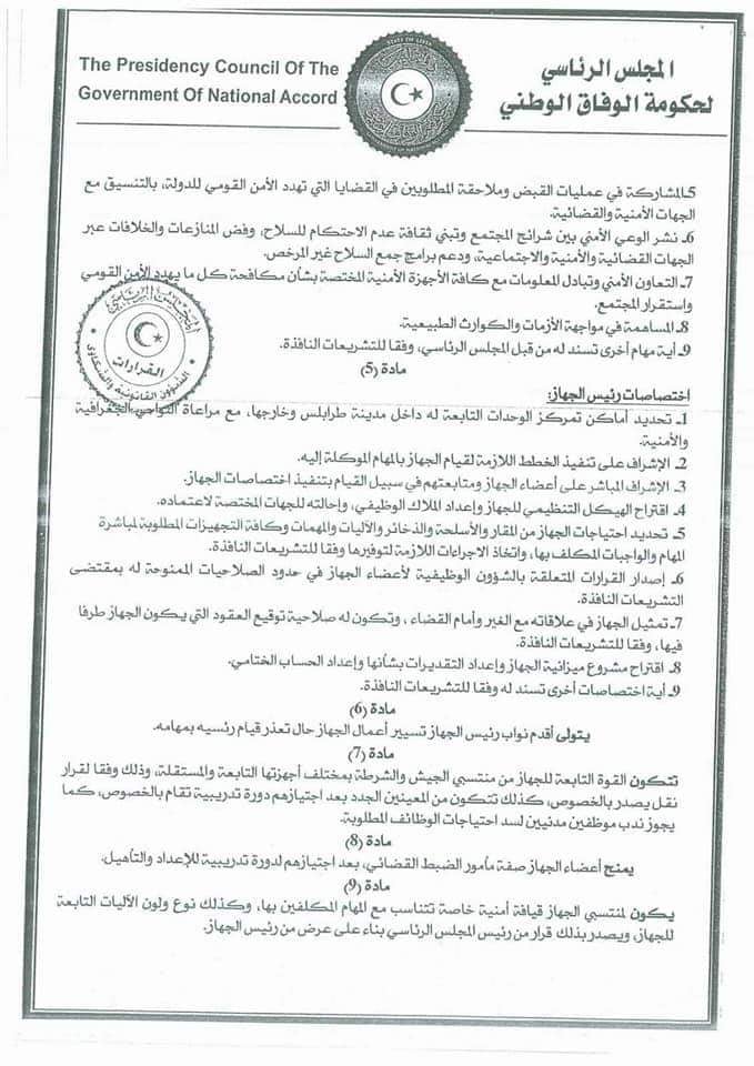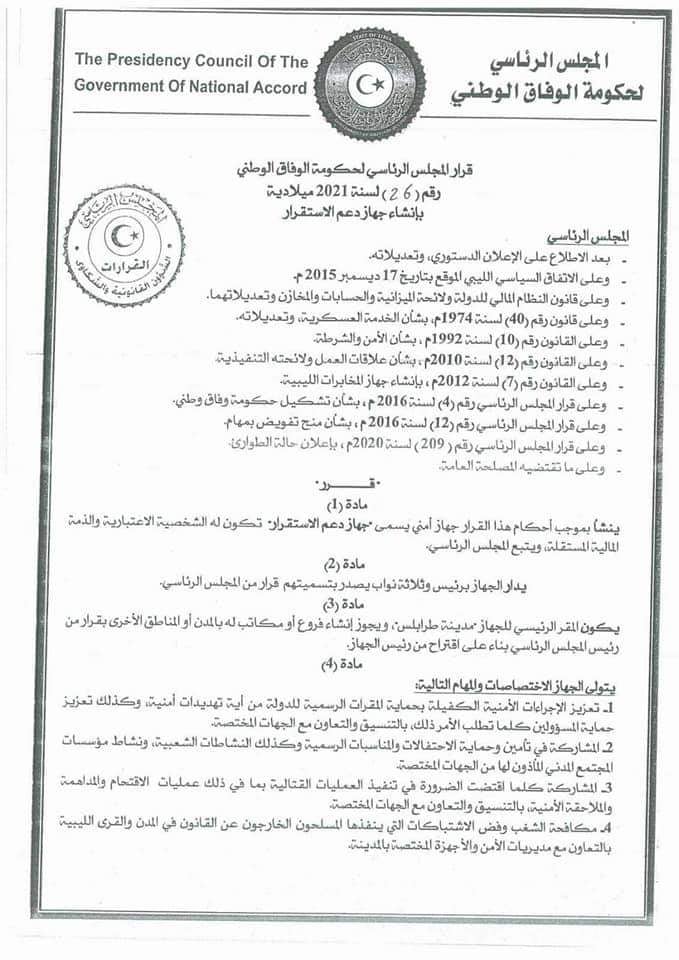السراج أنشأ بموجب القرار رقم “38” للعام الحالي الذي اطلعت المرصد على نسخة منه جهازًا أمنيًا يسمى “جهاز دعم الاستقرار”، على تكون له الشخصية الاعتبارية والذمة المالية المستقلة، ويتبع المجلس الرئاسي.