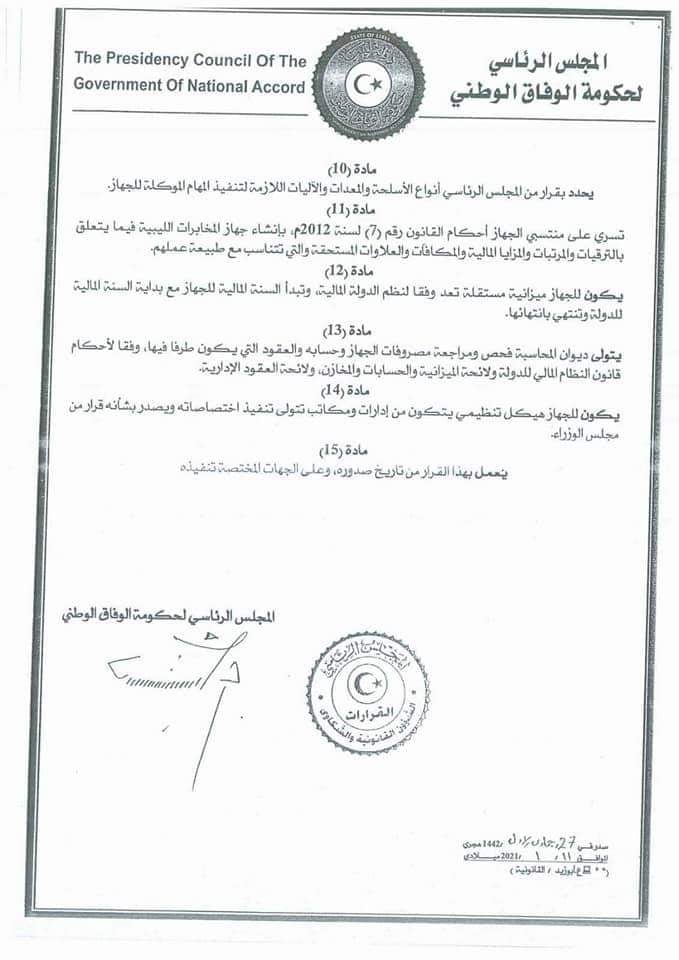 وأوضح أن الجهاز سيدار برئيس وثلاثة نواب يصدر بتسميتهم قرار من المجلس الرئاسي، على أن يكون المقر الرئيسي للجهاز مدينة طرابلس، كما يجوز إنشاء فروع أو مكاتب له بالمدن أو المناطق الأخرى بقرار من رئيس المجلس الرئاسي، بناء على اقتراح من رئيس الجهاز.