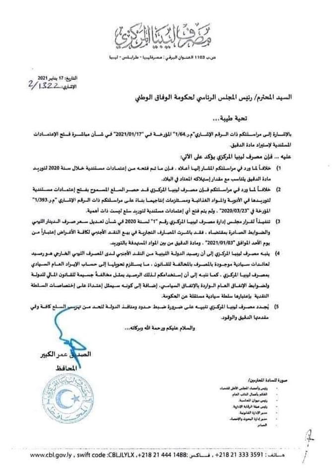 وأضافت مراسلة الكبير أنه وخلافًا لما ورد في مراسلة السراج، فإن المصرف المركزي في طرابلس حصر السلع المسموح بفتح اعتمادات مستندية لتوريدها في الأدوية والمواد الغذائية ومستلزمات إنتاجهماـ وفقًا لمراسلة سابقة لرئيس المجلس الرئاسي لحكومة الوفاق مؤرخة في الـ23 من مارس عام 2020.