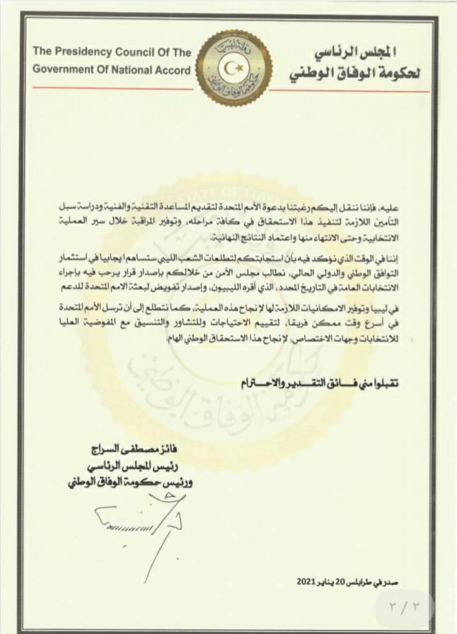 السراج طالب في رسالته بإصدار قرار من مجلس الأمن لدعم هذه العملية في التاريخ المحدد، ومنح تفويض للبعثة الأممية لدى ليبيا لدعمها وتوفير الإمكانات اللازمة لها لتقدم المساعدة التقنية والفنية .