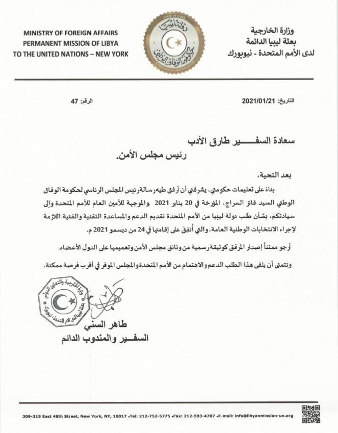 السراج طالب في رسالته بإصدار قرار من مجلس الأمن لدعم هذه العملية في التاريخ المحدد، ومنح تفويض للبعثة الأممية لدى ليبيا لدعمها وتوفير الإمكانات اللازمة لها لتقدم المساعدة التقنية والفنية .
