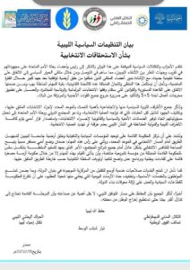 وذكّرت التنظيمات السياسية جميع الأطراف الليبية السياسية منها والاجتماعية بأهمية التمسك بالموعد المحدد لإجراء الانتخابات المتفق عليها، وتكثيف الجهود لتذليل كل العقبات التي قد تواجه العملية الانتخابية.