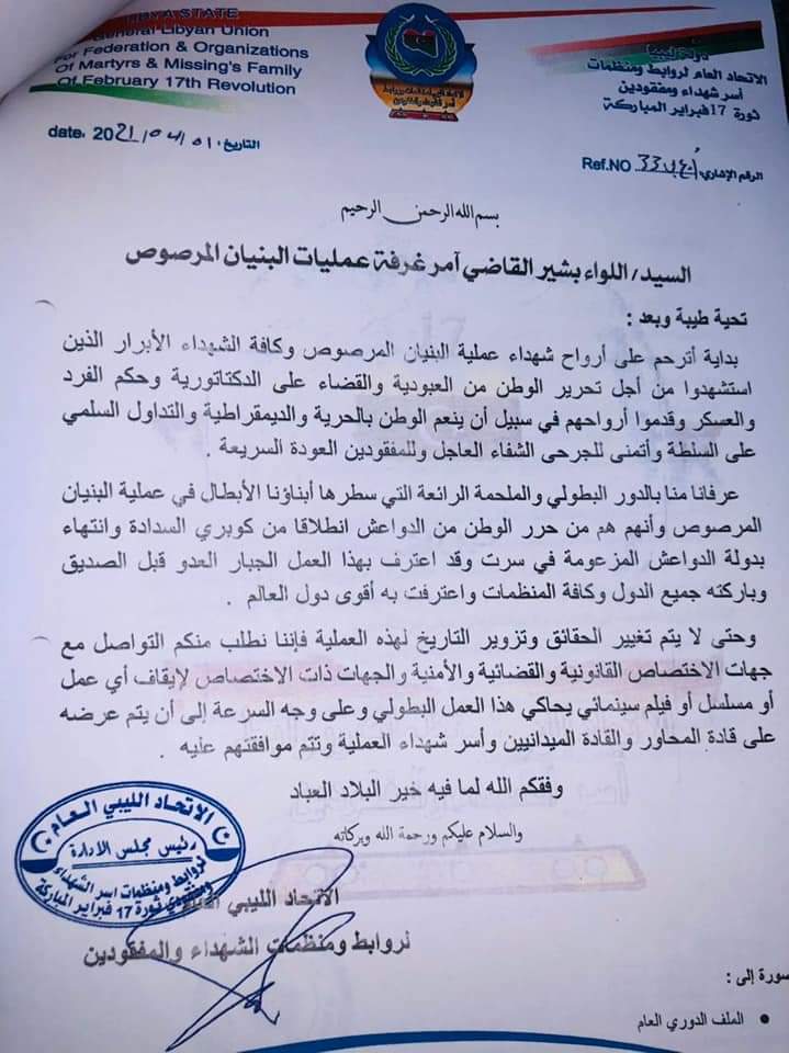 وتلقى اللواء القاضي في ذات السياق ، رسالة من موقعة من قبل 100 سيد وسيدة هم أباء وأبناء وإخوة و والدات وزوجات ” شهداء البنيان المرصوص ” طالبوا من خلالها بنفس المطلب ألا وهو وقف العرض واتخاذ اجراءات قانونية بالخصوص .