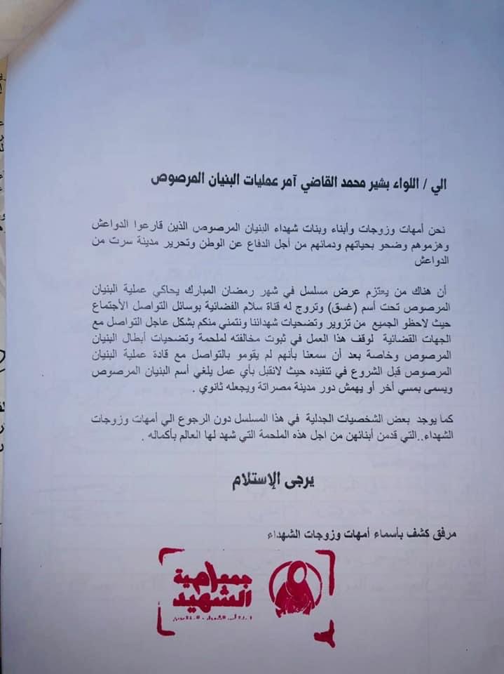 وطالب أهالي ” الشهداء ” وزوجاتهم في رسالتين موجهتين لآمر العملية اللواء بشير القاضي بوقف المسلسل من خلال اتخاذ الاجراءات القانونية وقالوا بأن العمل مخالف للحقيقة مع وجود شخصيات جدلية به وعدم التواصل مع القادة الحقيقيين للعملية .