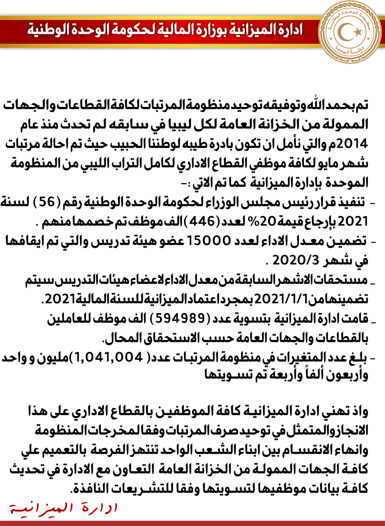 وأعلنت الإدارة تنفيذ قرار رئيس حكومة الوحدة الوطنية عبد الحميد الدبيبة ذي الرقم 56 لعام 2021 القاضي بإرجاع قيمة 20% لعدد 446 ألف موظف تم خصمها منهم، فضلًا عن القيام بتسوية عدد 594 ألفًا و989 موظفًا للعاملين بالقطاعات والجهات العامة حسب الاستحقاق المُحال.