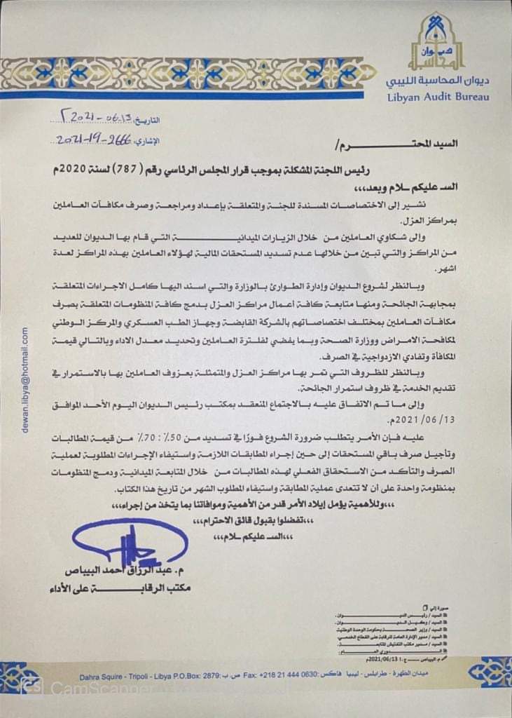 ليبيا – عقد رئيس ديوان المحاسبة خالد شكشك أمس الأحد اجتماعًا مع رئيس اللجنة المُشكّلة بموجب قرار المجلس الرئاسي رقم (787/2020)، نوقشت خلاله الصعوبات والعراقيل التي تعيق العمل بمراكز العزل وعزوف العاملين بها.