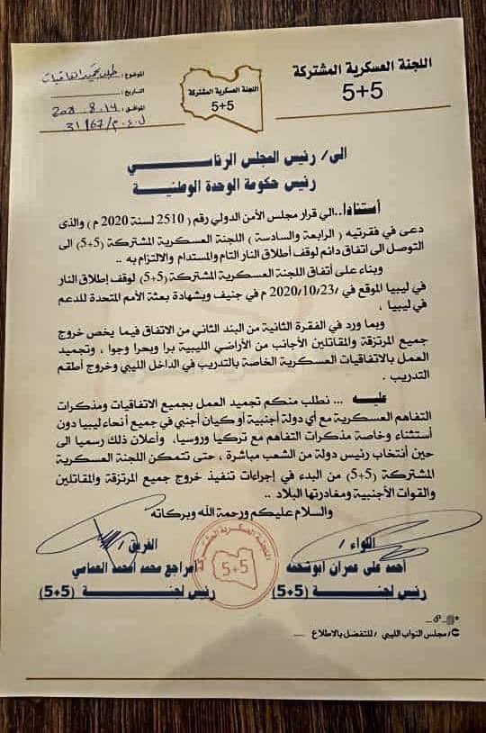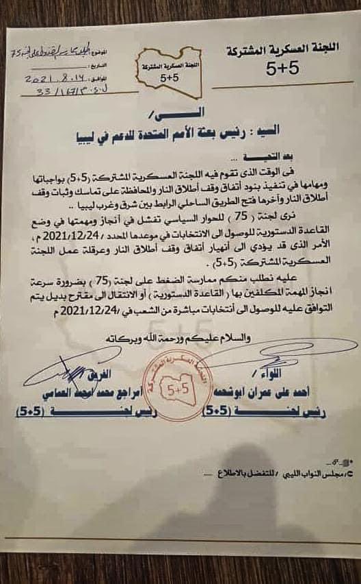 وبحسب المخاطبة فقد تم الإشارة إلى قرار مجلس الأمن الدولي رقم 2510 لعام 2020 الذي دعا في فقرتيه الرابعة والسادسة اللجنة للتوصل لاتفاق دائم لوقف إطلاق النار التام والمستدام والالتزام به وهو ما قامت اللجنه به في الـ23 من أكتوبر من ذات العام بشهادة البعثة الأممية.