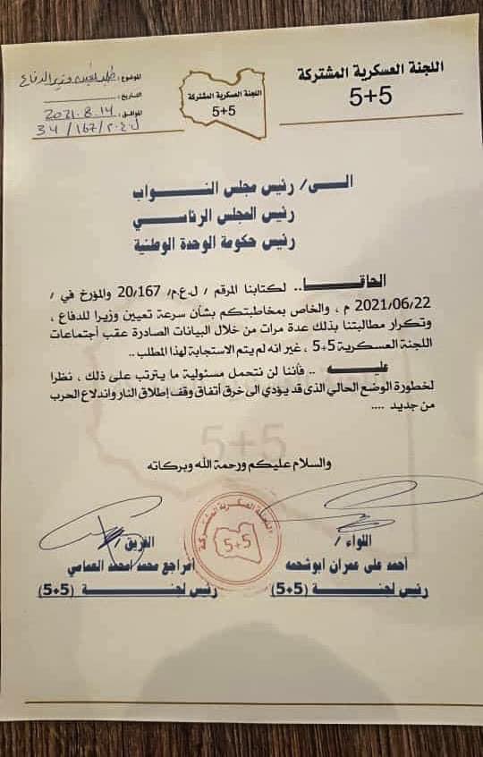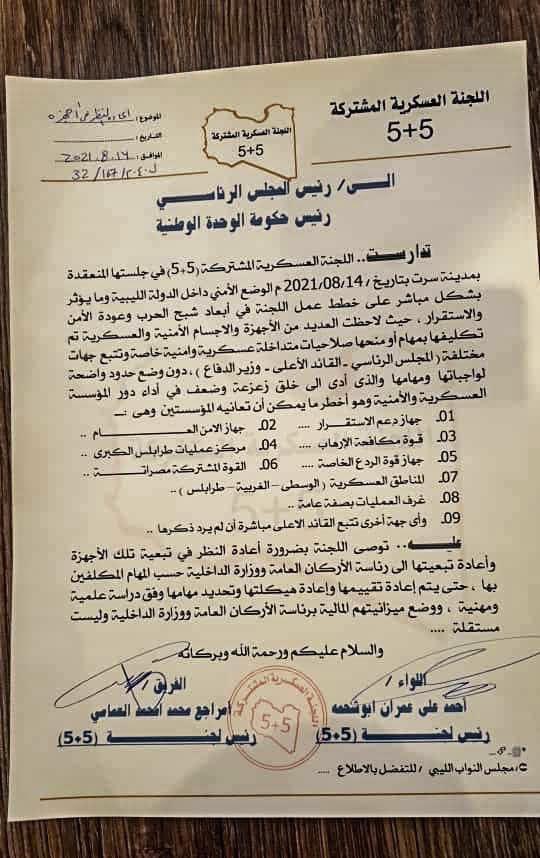 ليبيا- بعثت لجنة الـ10 العسكرية المشتركة 4 مخاطبات رسمية إلى رؤساء مجلس النواب والمجلس الرئاسي وحكومة الوحدة الوطنية بالإضافة للمبعوث الأممي.