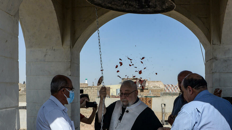 العراق – بعد 7 سنوات من سيطرة تنظيم “داعش” على المدينة، قرع جرس كنيسة مار توما من جديد في الموصل القديمة وسط زغاريد المصلين.