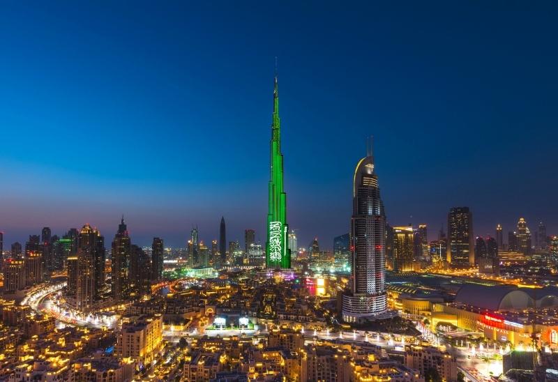 دبي – أضاء برج خليفة في إمارة دبي، أمس بالعلم السعودي الأخضر، احتفالا باليوم الوطني الـ91 للمملكة العربية السعودية.