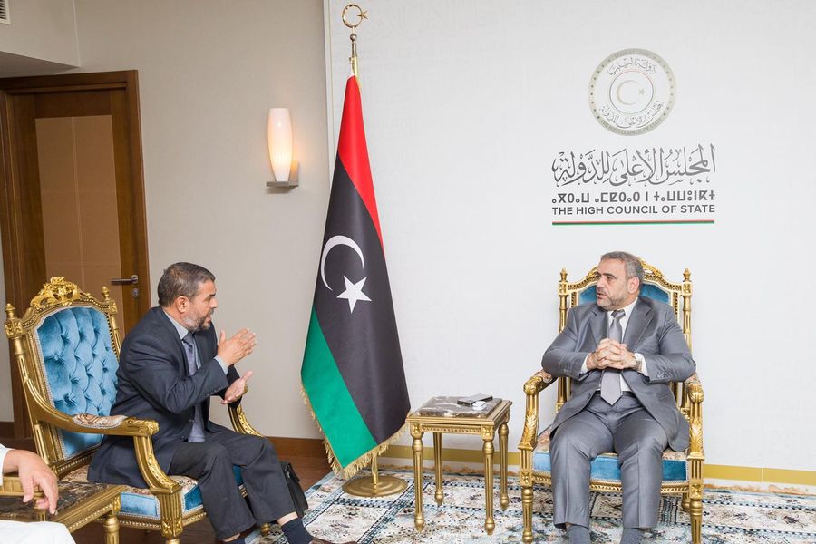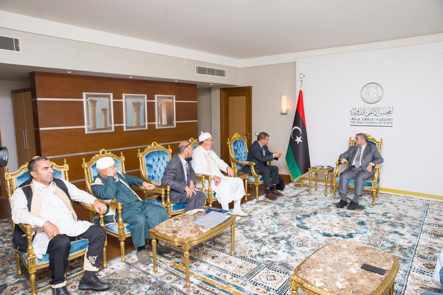 ليبيا – التقى رئيس مجلس الدولة الاستشاري خالد المشري القيادي في حزب العدالة والبناء الذراع السياسي لجماعة الاخوان المسلمين اليوم الإثنين رئيسَ ما يعرف بـ” المجلس الأعلى لأعيان وحكماء ليبيا” علي جبودة، وعددًا من أعضاء المجلس، في طرابلس.