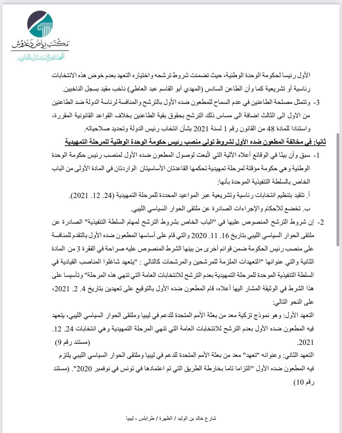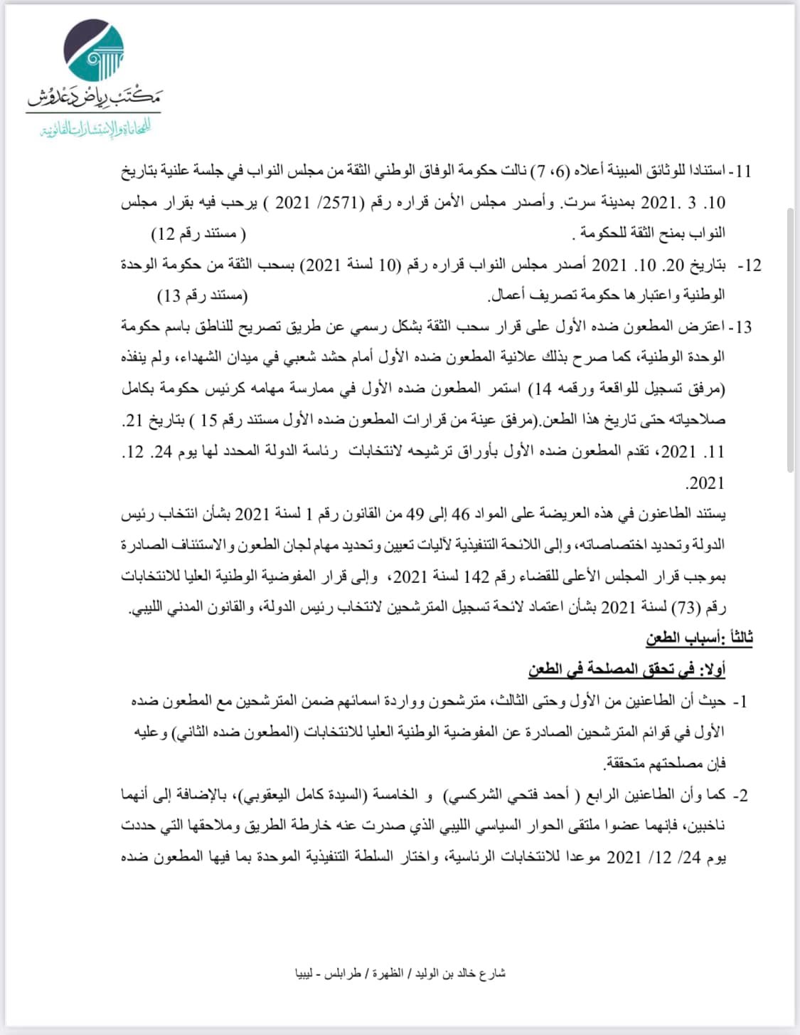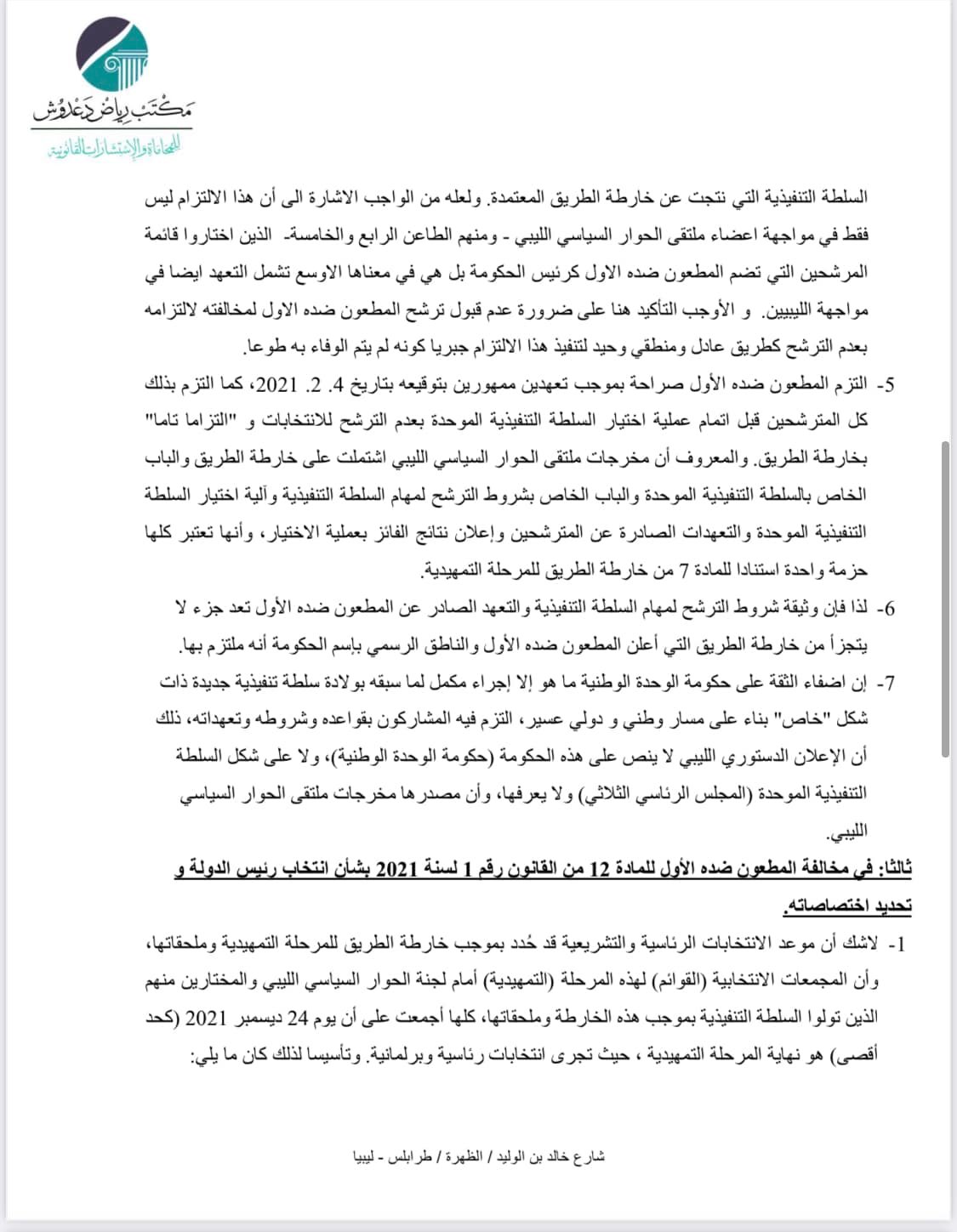 وبحسب الطعن فإن الشريعة الإسلامية نصت بوضوح على احترام التعهدات فيما نصت خارطة الطريق على عدم ترشح أعضاء الحكومة للانتخابات والإخلال بها يفتح باب فتنة ويهدد عملية السلام مبينا أن الدبيبة لم يعترف بسحب الثقة وأعلن أمام حشد بميدان الشهداء رفضه للقرار واعتبره غير شرعي واستمر بمهامه .