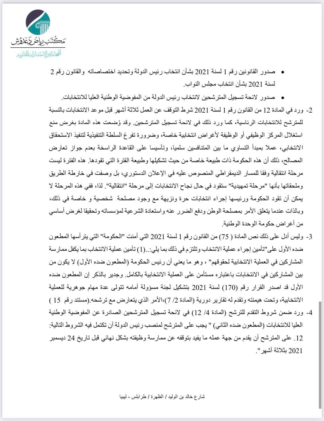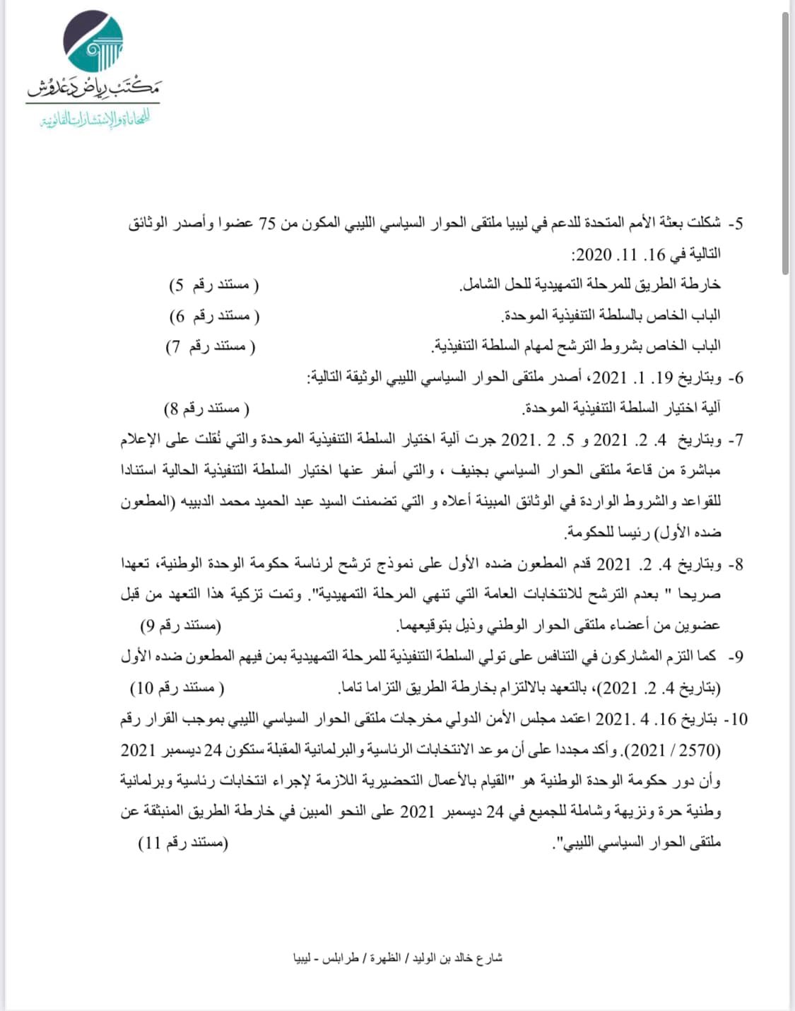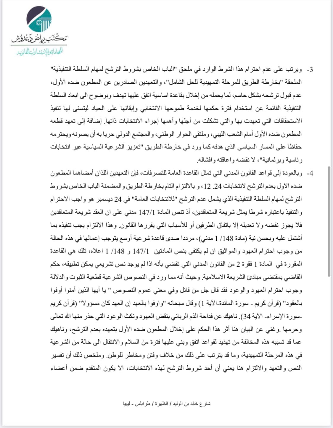 وبحسب الطعن فإن الشريعة الإسلامية نصت بوضوح على احترام التعهدات فيما نصت خارطة الطريق على عدم ترشح أعضاء الحكومة للانتخابات والإخلال بها يفتح باب فتنة ويهدد عملية السلام مبينا أن الدبيبة لم يعترف بسحب الثقة وأعلن أمام حشد بميدان الشهداء رفضه للقرار واعتبره غير شرعي واستمر بمهامه .