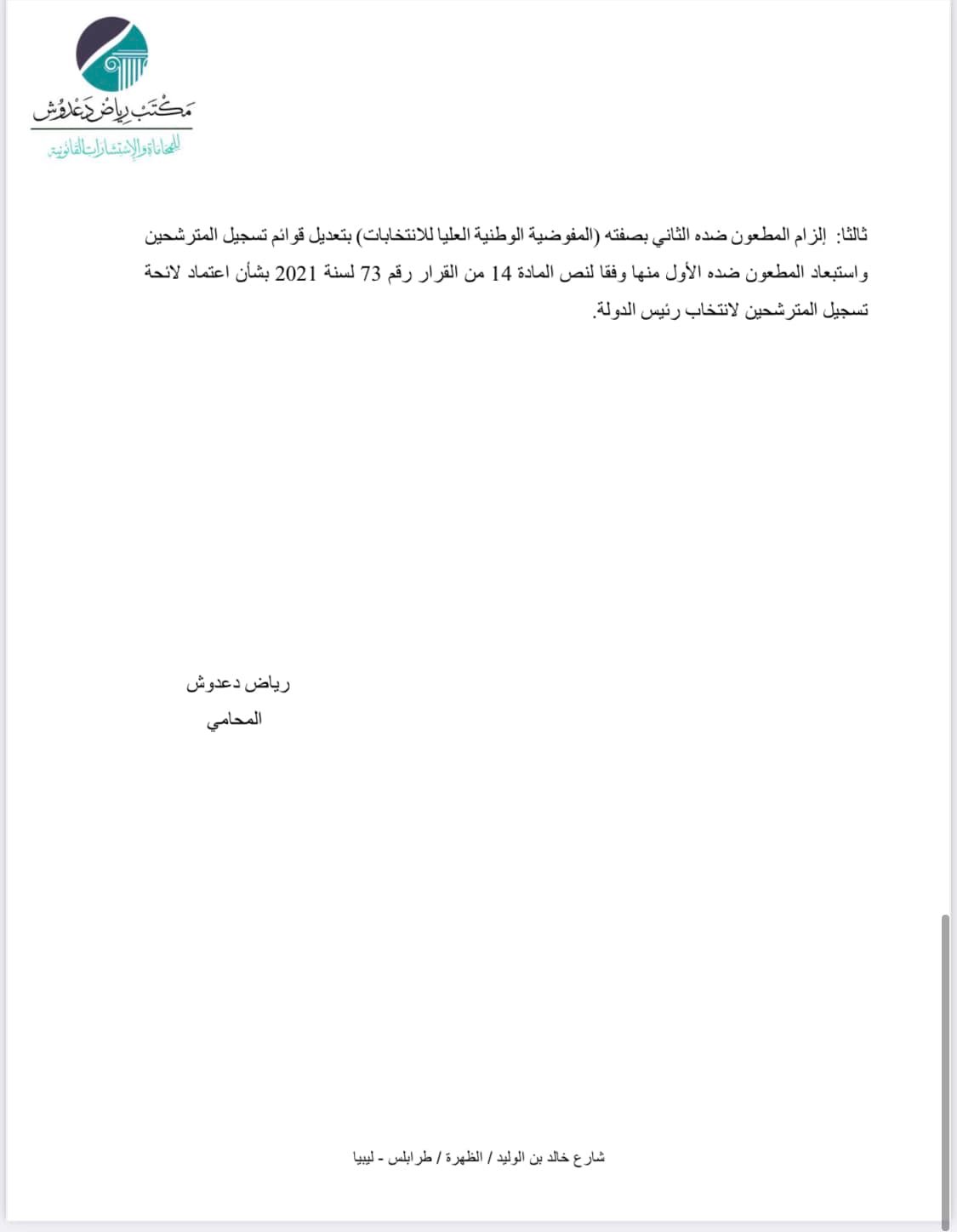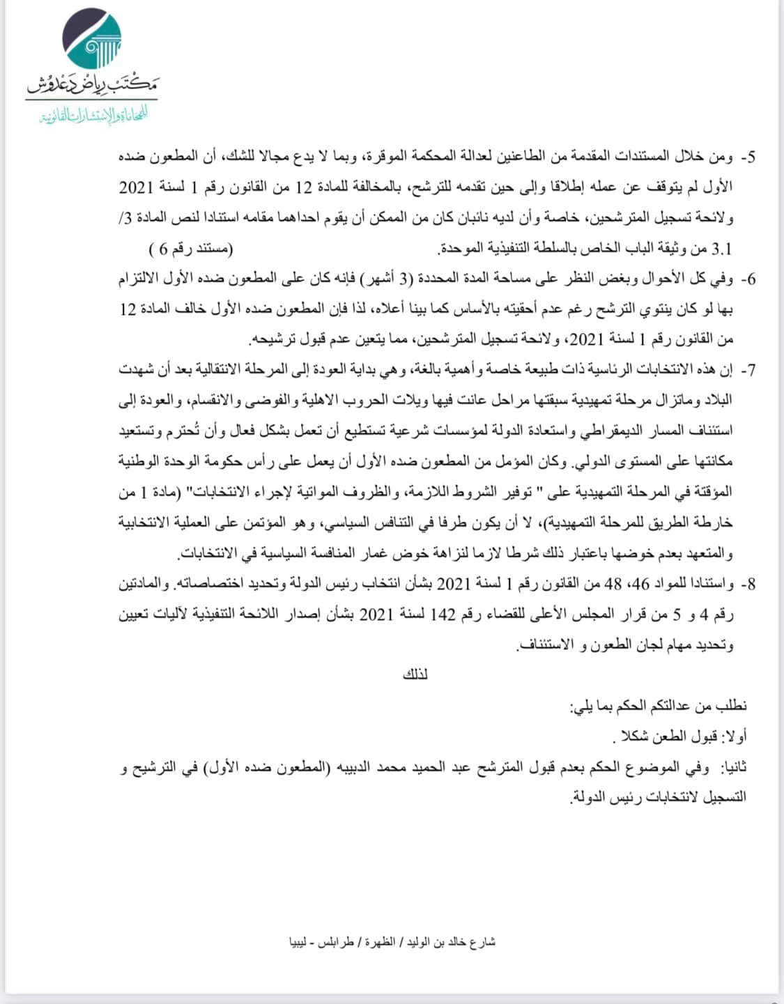 وقدم الطعن الثاني الذي تحصل على ذات القبول والقرار المرشح الرئاسي وزير الداخلية بحكومة الوفاق فتحي باشاآغا فيما تحصلت صحيفة المرصد على نسخة من صحيفة الطعن الأول المقدم من السداسي الذي استند على مخالفة الدبيبة لقانون الانتخابات الرئاسية وعدم تقيده بشرط المادة الـ12 منه.