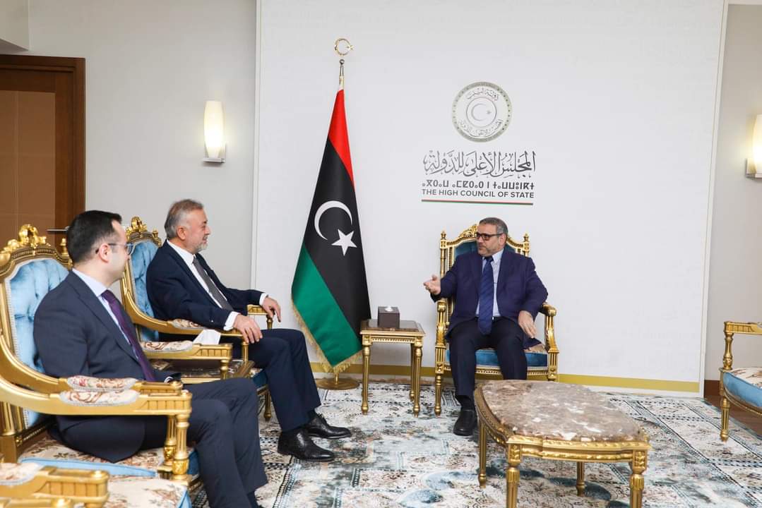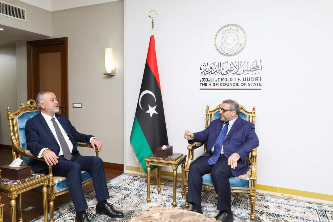 ليبيا – التقى رئيس مجلس الدولة الاستشاري خالد المشري القيادي بحزب العدالة والبناء الذراع السياسي لجماعة الإخوان أمس الخميس سفيرَ دولة تركيا لدى ليبيا كنعان يلمز بمقر المجلس في العاصمة طرابلس.
