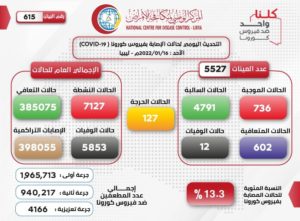 ليبيا – أعلن المركز الوطني لمكافحة الأمراض اليوم الإثنين حصيلة يوم أمس الأحد بتسجيل 736 إصابة جديدة بفيروس كورونا، إضافة إلى 12 حالة وفاة خلال الـ 24 ساعة الماضية و127 حالة جرحة.