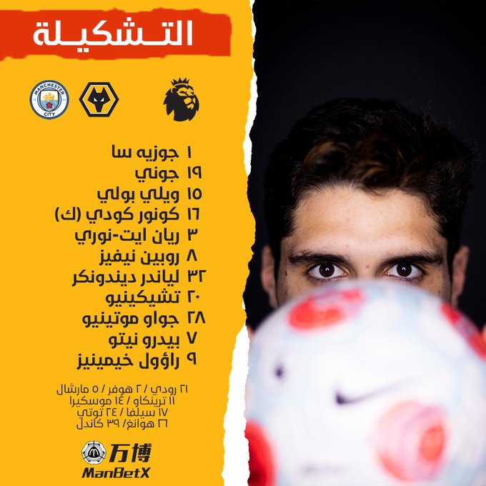 وسيبدأ البرتغالي برونو لاجي (45 عاما) المدير الفني لنادي وولفرهامبتون، بالتشكيلة الأساسية التالية لمواجهة فريق مانشستر سيتي: