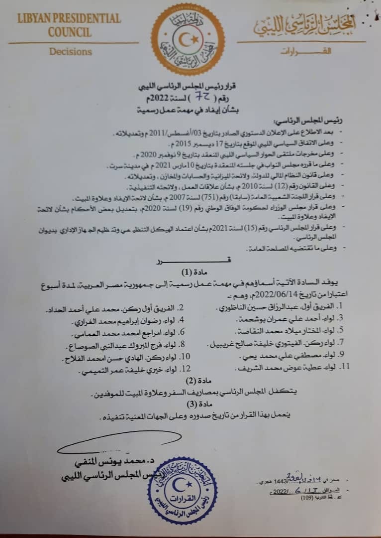 ليبيا – انتقد مدير إدارة التوجيه المعنوي بالقوات المسلحة اللواء خالد المحجوب قرار رئيس المجلس الرئاسي محمد المنفي رقم 72 لسنة 2022 الصادر بتاريخ اليوم لإيفاد 5+5 بمهمة عمل رسمية إلى القاهرة متهمًا اياه بالقفز على عمل الآخرين كون اللجنة التابعة للقيادة العامة أصلا سافرت منذ يومين ولم تتلقى قرارها منه علاوة على توصيفه الخاطئ لرتب ضباطها .