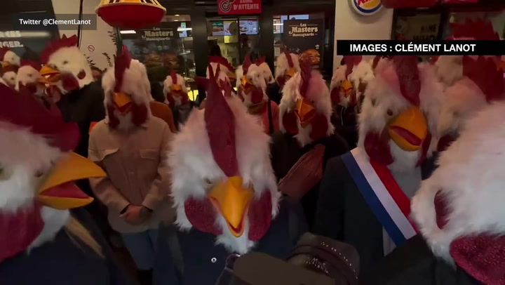 باريس – أقتحم نشطاء من جمعية المدافعين عن حقوق الحيوان المسماة “L214″، مطعم “برغر كينغ” في العاصمة الفرنسية باريس، مرتدين أقنعة على شكل رأس دجاجة، ووقفوا لحظة صمت على أرواح الدجاج.