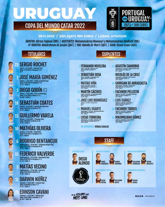 بينما وضع المدير الفني لمنتخب الأوروغواي، دييجو ألونسو (47 عاما)، التشكيلة الأساسية التالية لخوض مباراته الأولى في البطولة ضد نظيره البرتغالي: