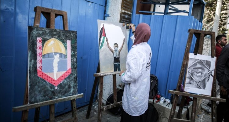وفي الفعالية الأولى التي نظمتها مؤسسات محلية فلسطينية، أمام مقر منسق الأمم المتحدة لعملية السلام في الشرق الأوسط “أونسكو” بمدينة غزة، رسم فنانون لوحات تشكيلية تعبّر عن القضايا الوطنية الفلسطينية.