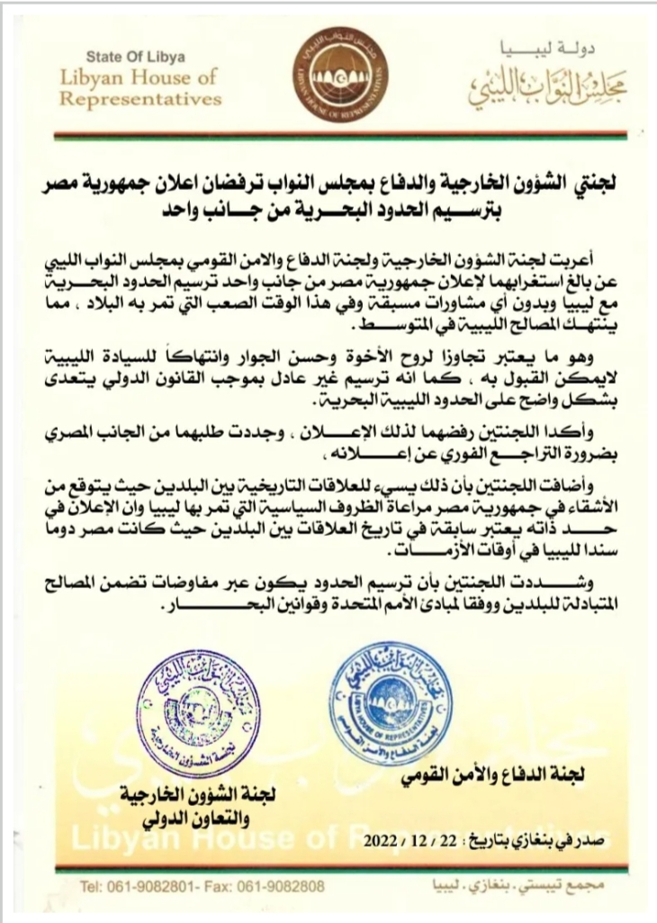 ليبيا – أعربت لجنة الشؤون الخارجية ولجنة الدفاع والأمن القومي بمجلس النواب عن بالغ استغرابهما لإعلان جمهورية مصر من جانب واحد ترسيم الحدود البحرية مع ليبيا، ودون أي مشاورات مسبقة، وفي هذا الوقت الصعب التي تمر به البلاد، مما ينتهك المصالح الليبية في المتوسط.