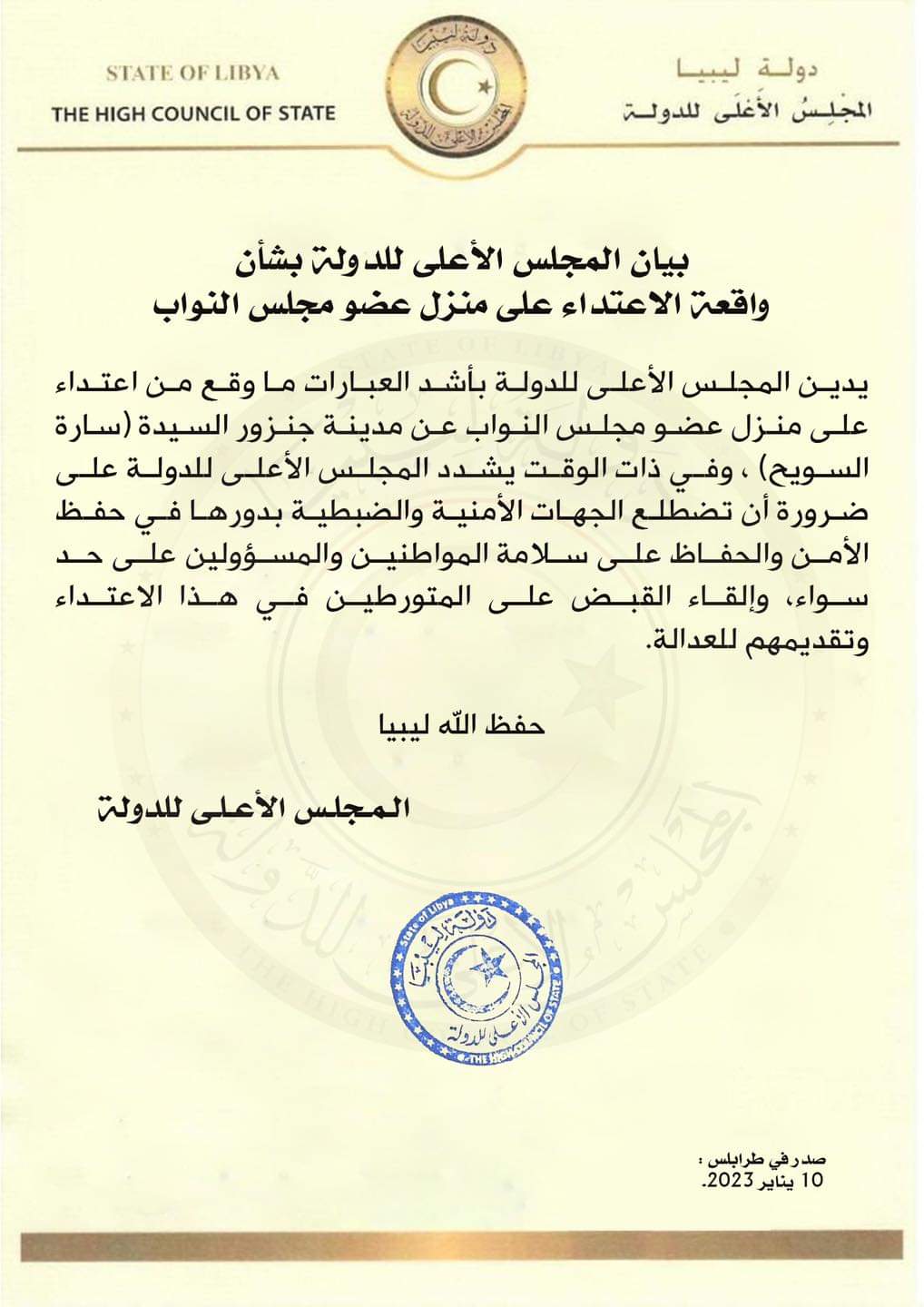 ليبيا – أدان مجلس الدولة الاستشاري في بيان له بأشد العبارات ما وقع من اعتداء على منزل عضو مجلس النواب عن مدينة جنزور سارة السويح.