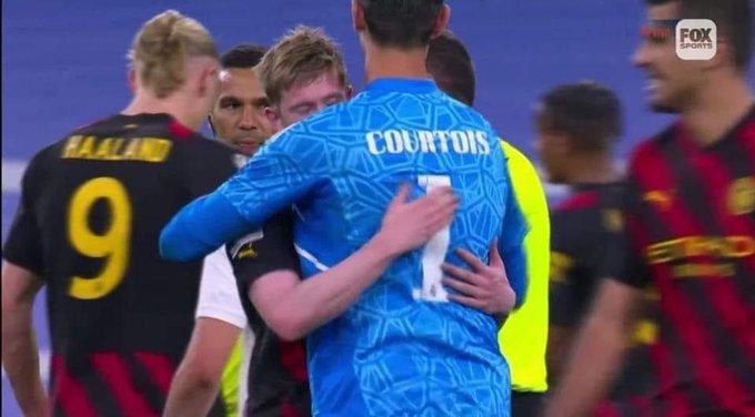 وأظهرت لقطات تلفزيونية عناق كورتوا ودي بروين بعد المباراة التي انتهت بتعادل الفريقين بهدف لمثله، على ملعب “سانتياغو برنابيو”.