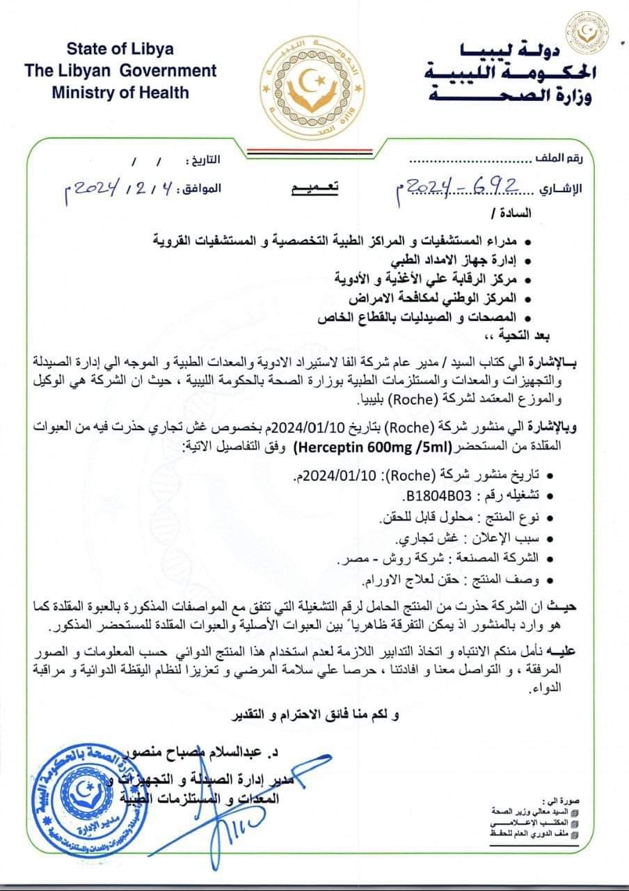 ليبيا – حذرت وزارة الصحة في حكومة الاستقرار من غش تجاري (عبوات مقلدة) لمستحضر (Herceptin600mg/5ml) لعلاج الأورام من شركة روش المصرية.