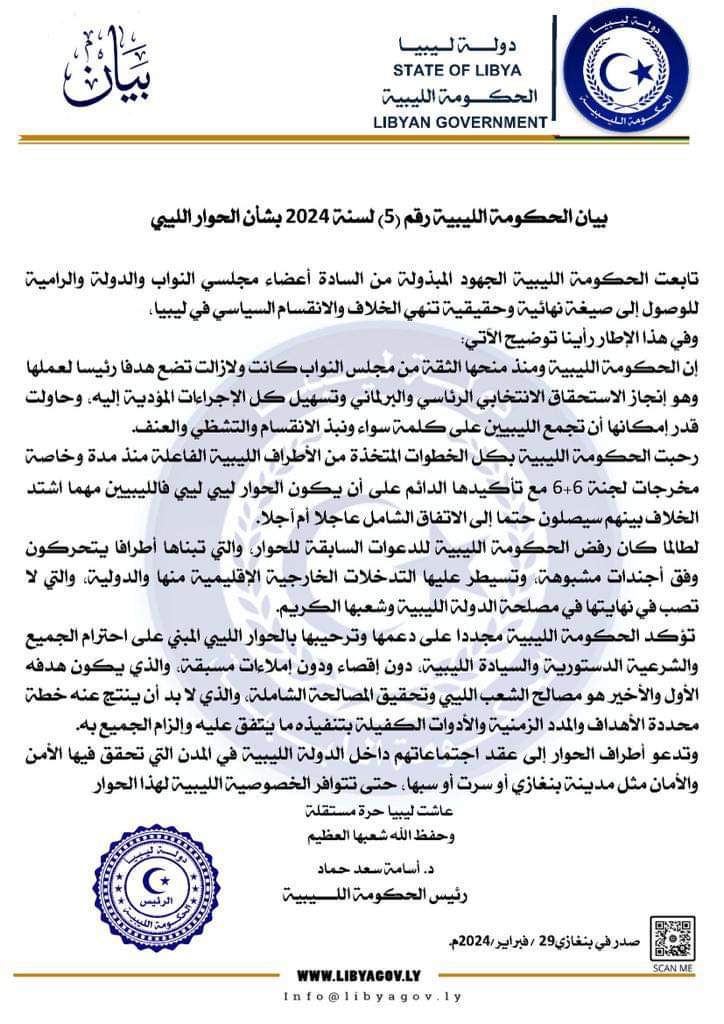 وقال حماد:”وفي هذا الإطار رأينا توضيح الآتي: إن الحكومة الليبية ومنذ منحها الثقة من مجلس النواب كانت ولا زالت تضع هدفا رئيسا لعملها وهو إنجاز الاستحقاق الانتخابي الرئاسي والبرلماني وتسهيل كل الإجراءات المؤدية إليه، وحاولت قدر إمكانها أن تجمع الليبيون على كلمة سواء ونبذ الانقسام والتشظي والعنف”.
