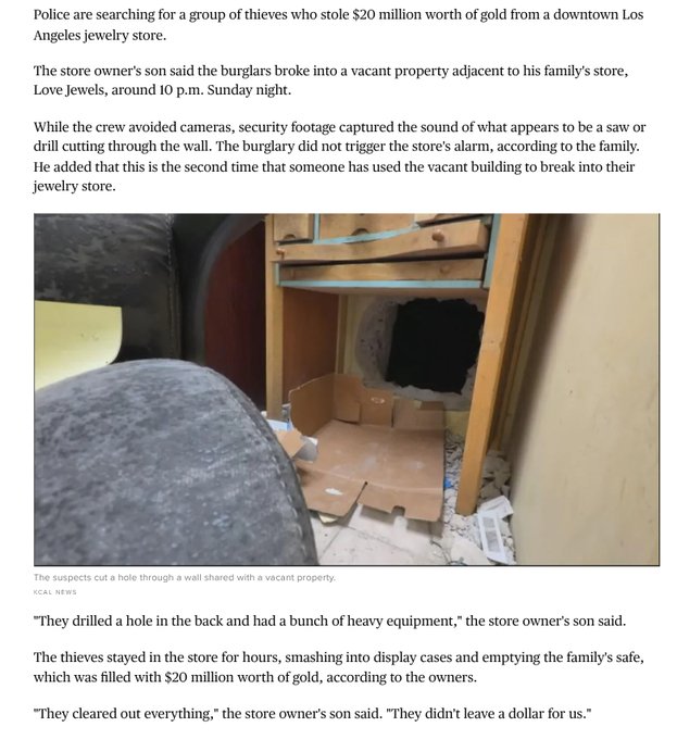 الولايات المتحدة – تمكن لصوص من حفر نفق للوصول إلى متجر مجوهرات في لوس أنجلوس الأمريكية، وسرقة ساعات ومجوهرات بقيمة 10 ملايين دولار.