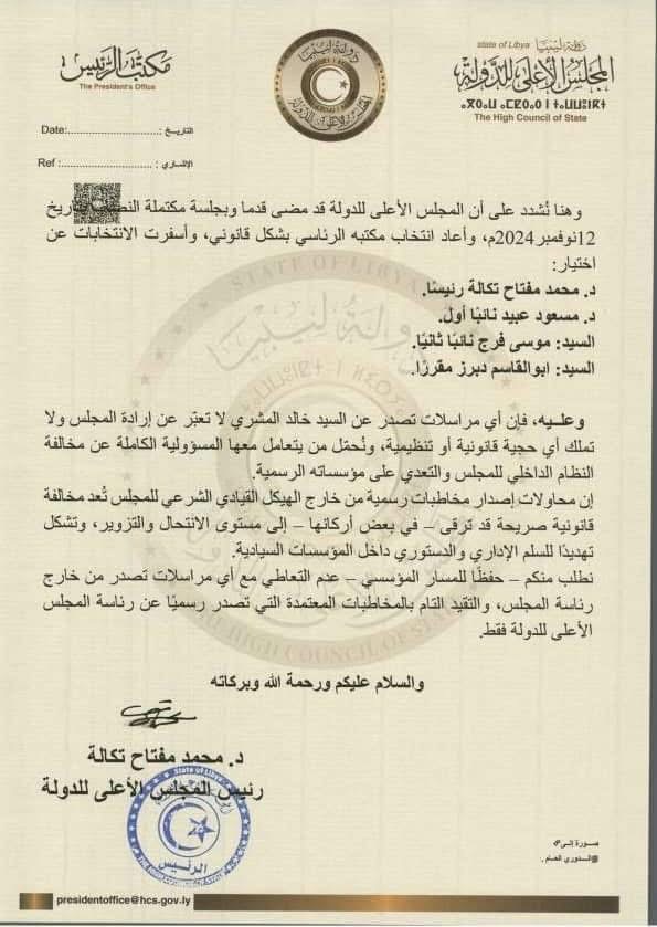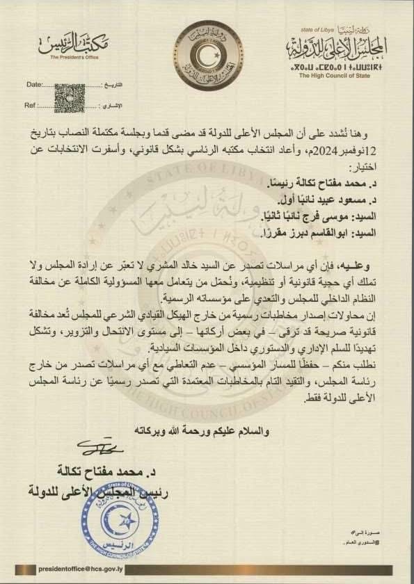 وأكد تكالة، في مراسلاته التي نقل تفاصيلها المكتب الإعلامي للمجلس، أن ما صدر مؤخرًا باسم المجلس الأعلى للدولة عبر خالد المشري لا يعكس الرأي الرسمي، مشيرًا إلى أن تلك المواقف تفتقر إلى السند القانوني والمؤسسي.