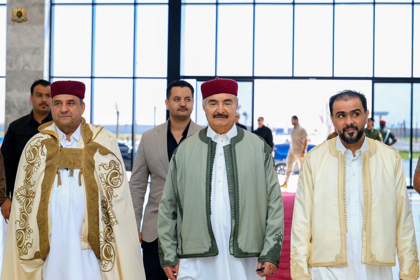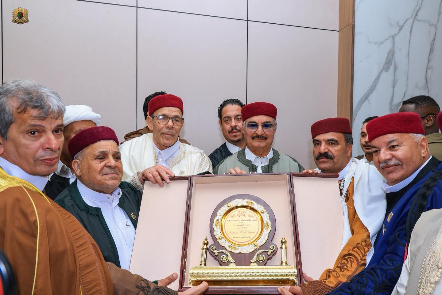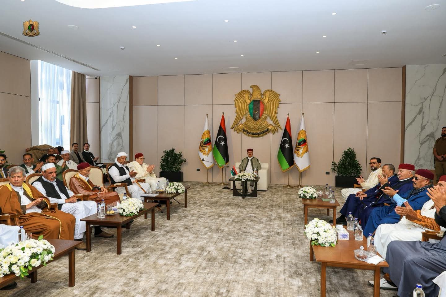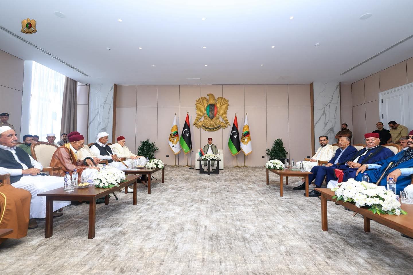 ليبيا – استقبل القائد العام للقوات المسلحة، المشير خليفة حفتر، مشايخ وأعيان وحكماء القبائل بالمنطقة الشرقية والوسطى والجنوبية الشرقية في مدينة المشير خليفة حفتر العسكرية، بحضور رئيس حكومة الاستقرار أسامة حماد، ورئيس الأركان العامة الفريق أول ركن خالد حفتر.