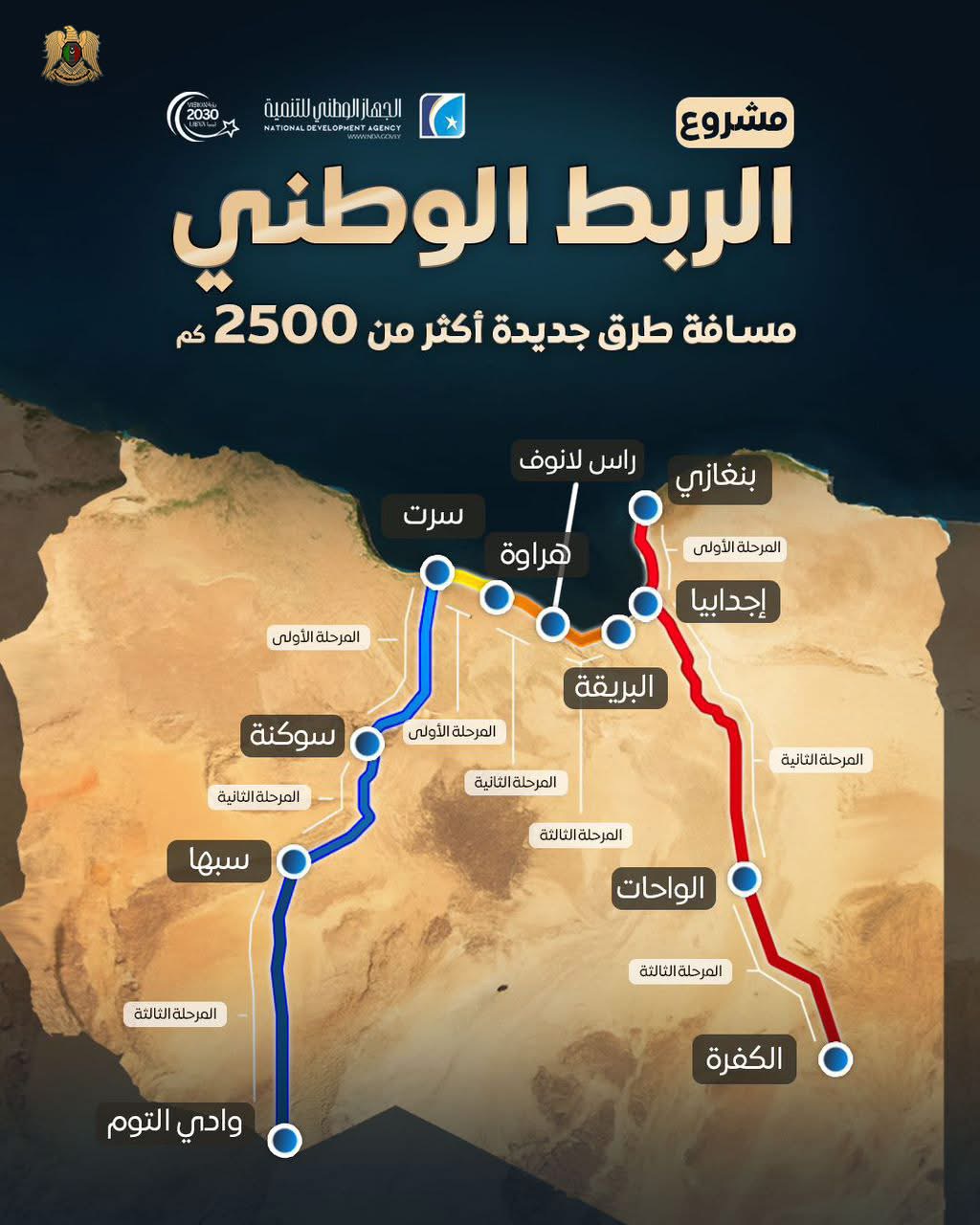 يمتد المشروع من مدينة سرت مرورًا بسوكنة والجفرة وصولًا إلى سبها ثم وادي التوم في أقصى الجنوب، بإجمالي مسافة تُقدَّر بنحو 1200 كم، ضمن مشروع الربط الوطني الذي يمتد من بنغازي إلى أجدابيا وصولًا إلى سرت شمالًا، والواحات والكُفرة في الجنوب الشرقي، والذي أطلقه الجهاز الوطني للتنمية بتعليمات من القيادة العامة.