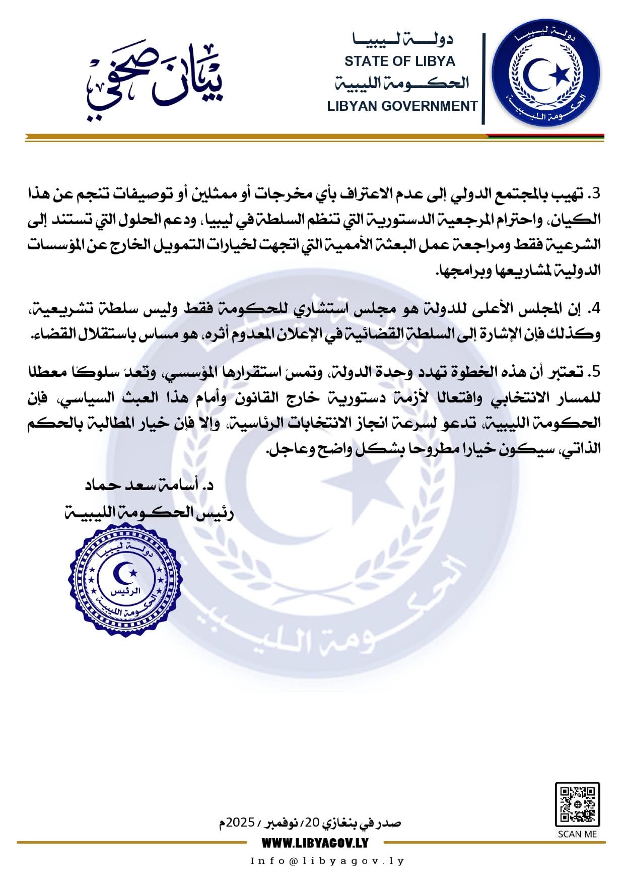 وأهاب حمّاد بالمجتمع الدولي عدم الاعتراف بأي مخرجات أو ممثلين أو توصيفات تنجم عن هذا الكيان، واحترام المرجعية الدستورية المنظمة للسلطة في ليبيا، ودعم الحلول التي تستند إلى الشرعية فقط، مع الدعوة إلى مراجعة عمل البعثة الأممية وتمويل مشاريعها وبرامجها خارج الأطر الدولية.