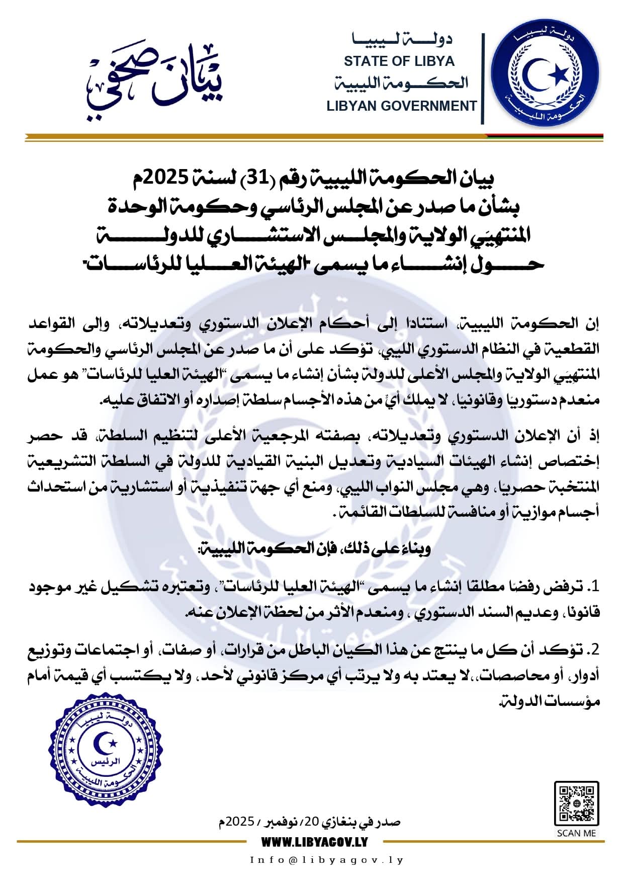 ليبيا – أكد رئيس الحكومة الليبية أسامة حمّاد أن ما صدر عن المجلس الرئاسي وحكومة عبد الحميد الدبيبة (الحكومة منتهية الولاية) ومجلس الدولة بشأن إنشاء ما يسمى بـ”الهيئة العليا للرئاسات” هو عمل منعدم دستورياً وقانونياً، موضحًا أن أيًّا من هذه الأجسام لا يملك سلطة إصداره أو الاتفاق عليه.