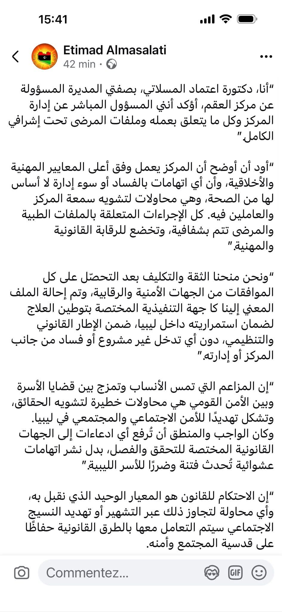 وأشار إلى أن المسلاتي تترأس لجنة علمية لعلاج العقم، بالإضافة إلى توليها إدارة مركز طبي بطريق المطار بقرارات حكومية صريحة.