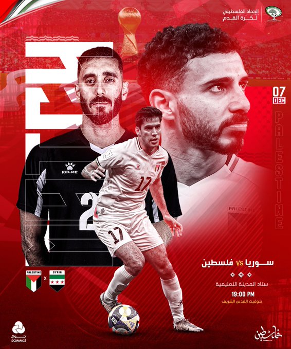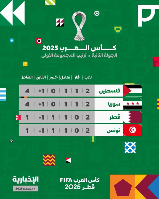 ويمتلك المنتخبان الرصيد ذاته من النقاط (4 نقاط) بعدما فاز المنتخب السوري على تونس وتعادل مع قطر، فيما حقق منتخب فلسطين فوزا ثمينا على قطر وتعادلا بطعم الانتصار أمام تونس ما يجعله متصدرا للمجموعة الأولى قبل الجولة الختامية ويحتاج نقطة للتأهل رسميا لربع النهائي ويحتل قطر وتونس ثالثا ورابعا بنقطة وحيدة لكل منهما.