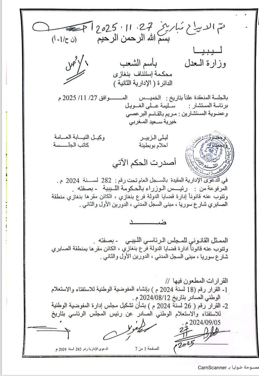 ليبيا – قضت محكمة استئناف بنغازي بقبول الطعن المقدم من رئيس حكومة الاستقرار أسامة حماد ضد القرارات الصادرة عن المجلس الرئاسي بشأن إنشاء المفوضية الوطنية للاستفتاء والاستعلام، الموازية للمفوضية الوطنية العليا للانتخابات.